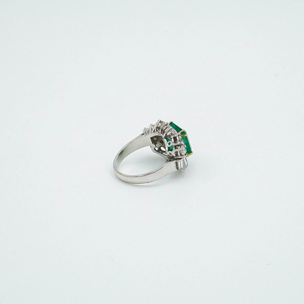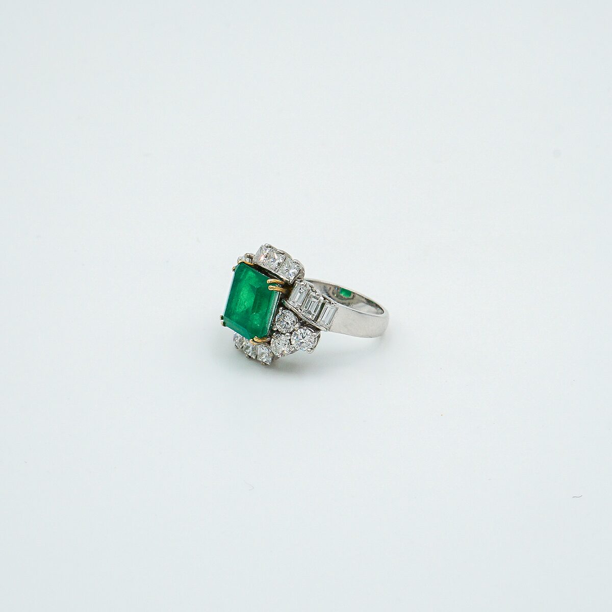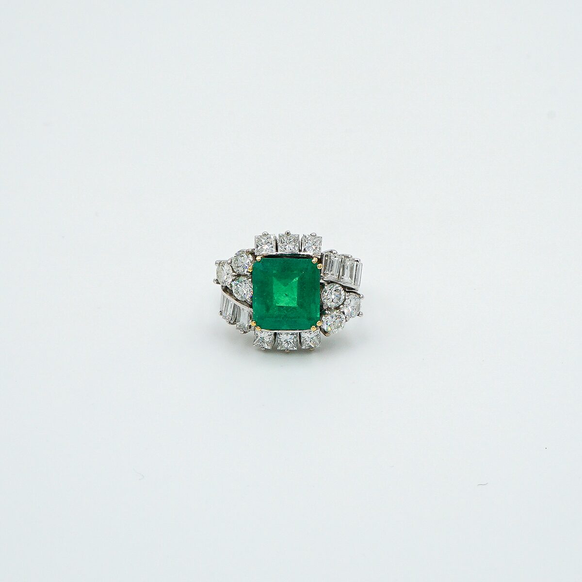 Revive el glamour de los años 50 con este anillo emblemático: una esmeralda colombiana central de 4,20 cts rodeada por una elegante orla de diamantes talla brillante y baguette. Cada piedra suma una sinfonía de luz y color verde intenso, capturando la sofisticación atemporal en un diseño que resuena tanto con coleccionistas como con amantes del estilo vintage.