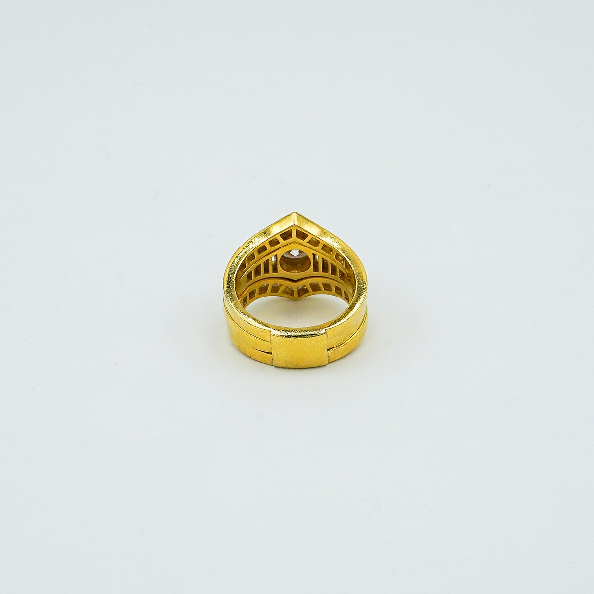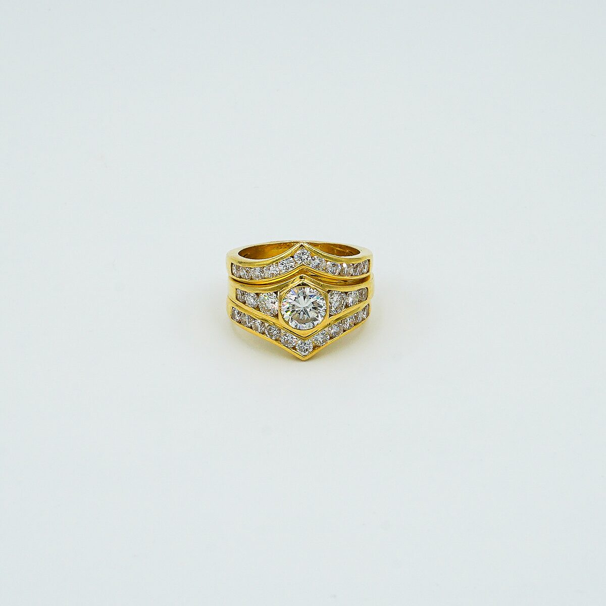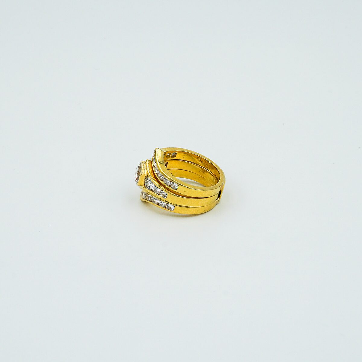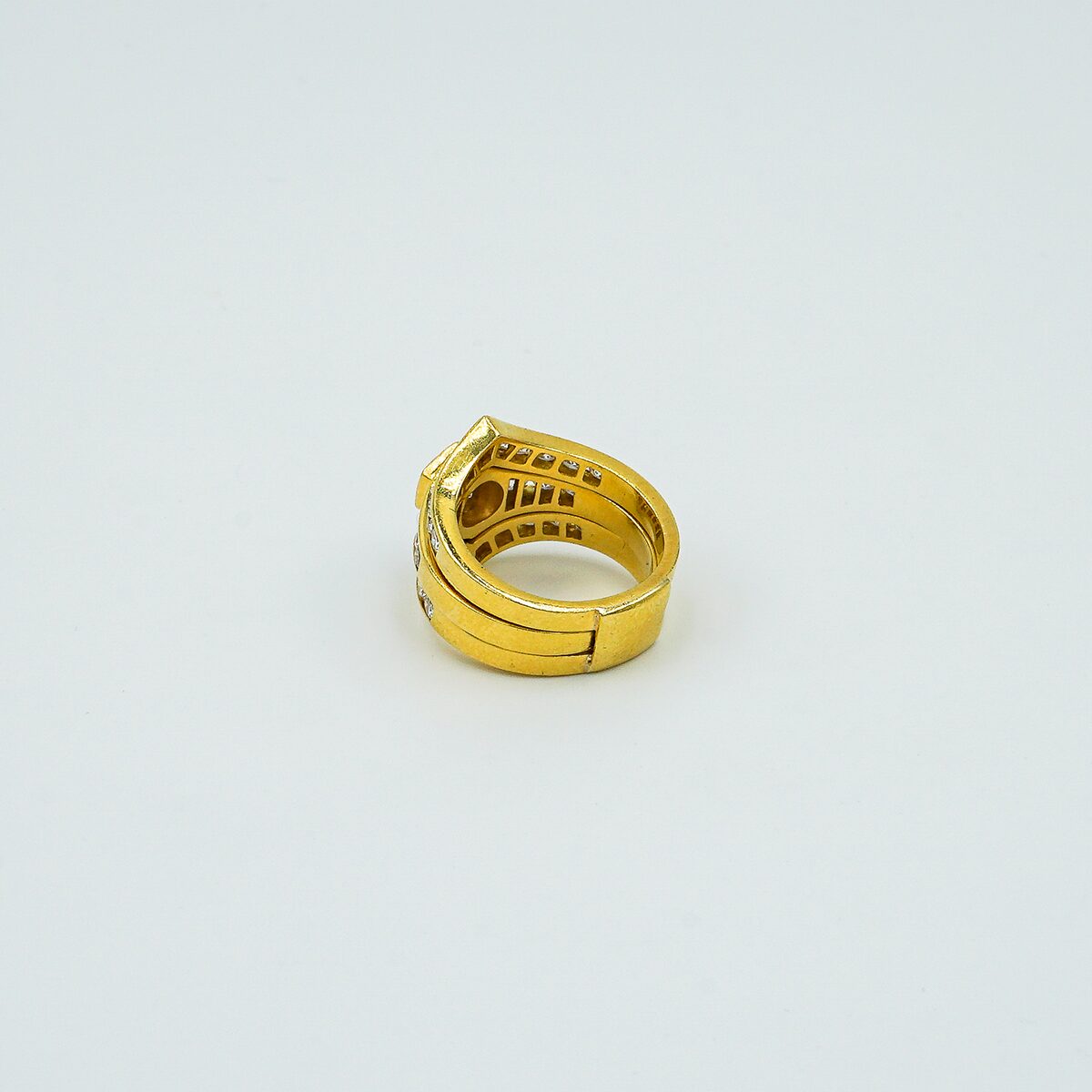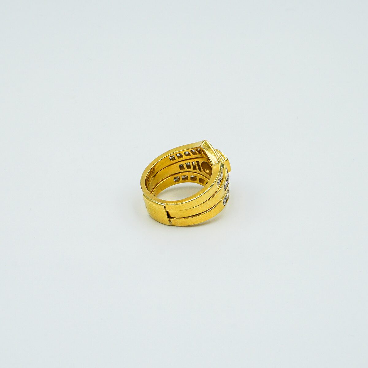 Anillo de los años 80 montado en oro amarillo de 18k con parte central desmontable con diamante central de 1.20 cts color G pureza VS1 y pave de diamantes talla brillante color G VS1 3.20 cts ( total sortija 4,20 cts).