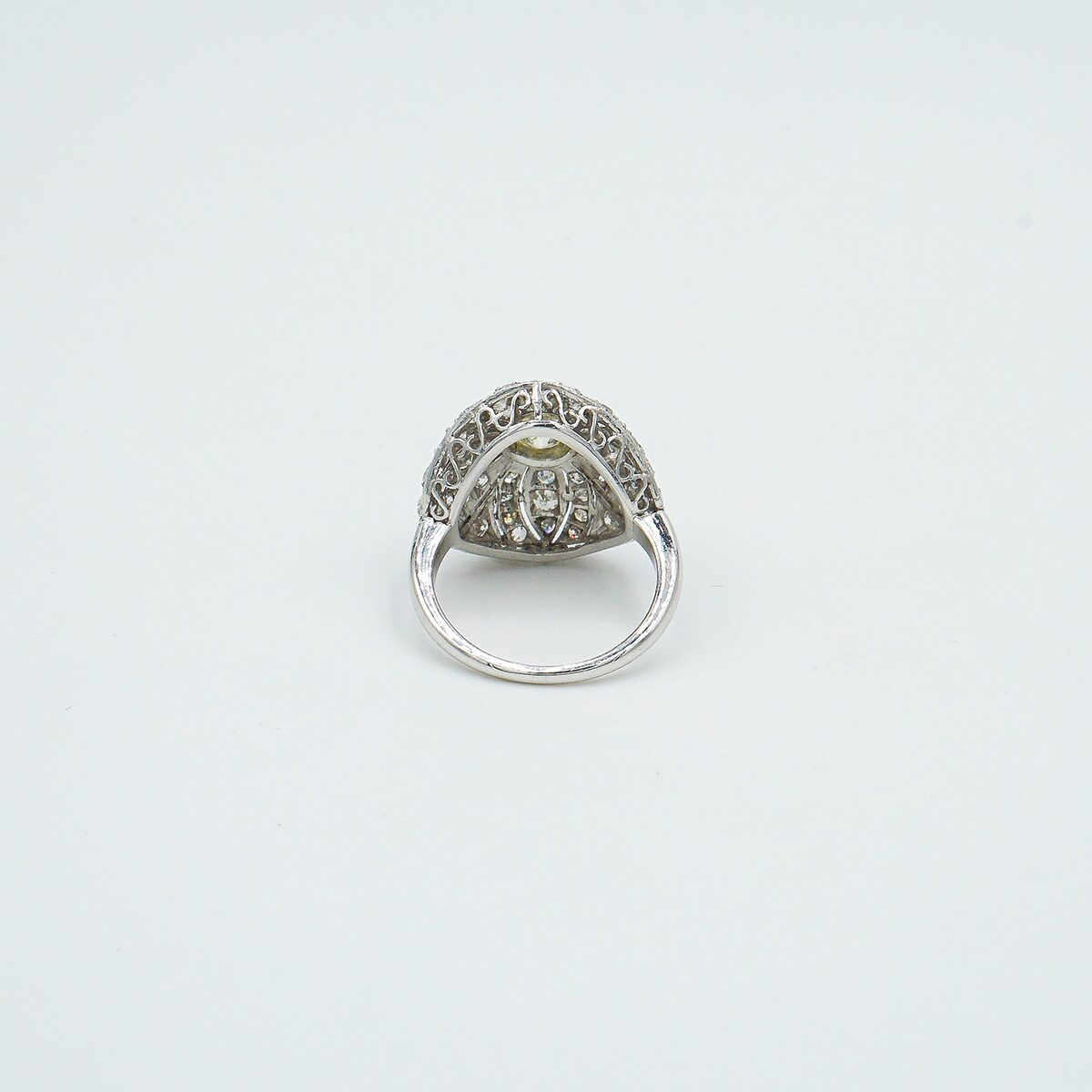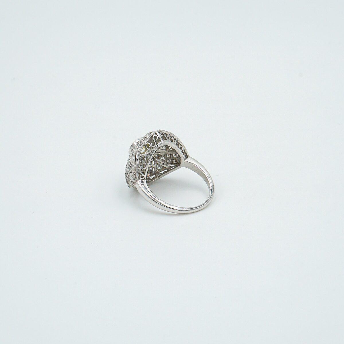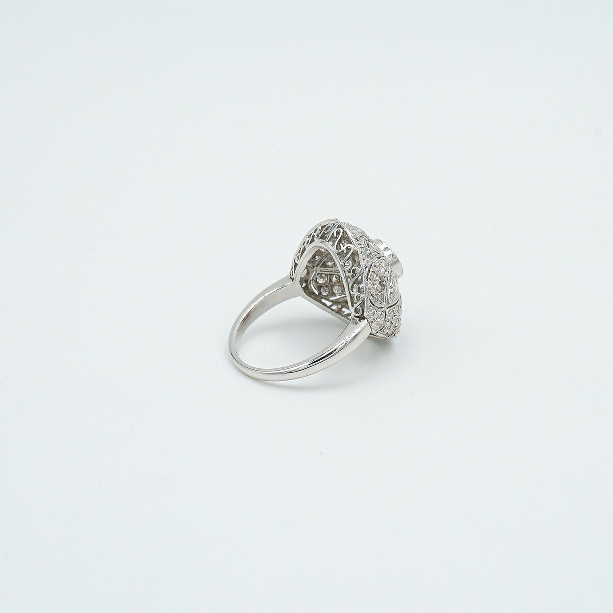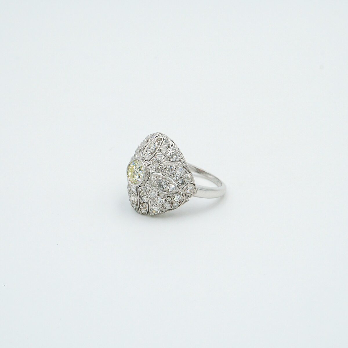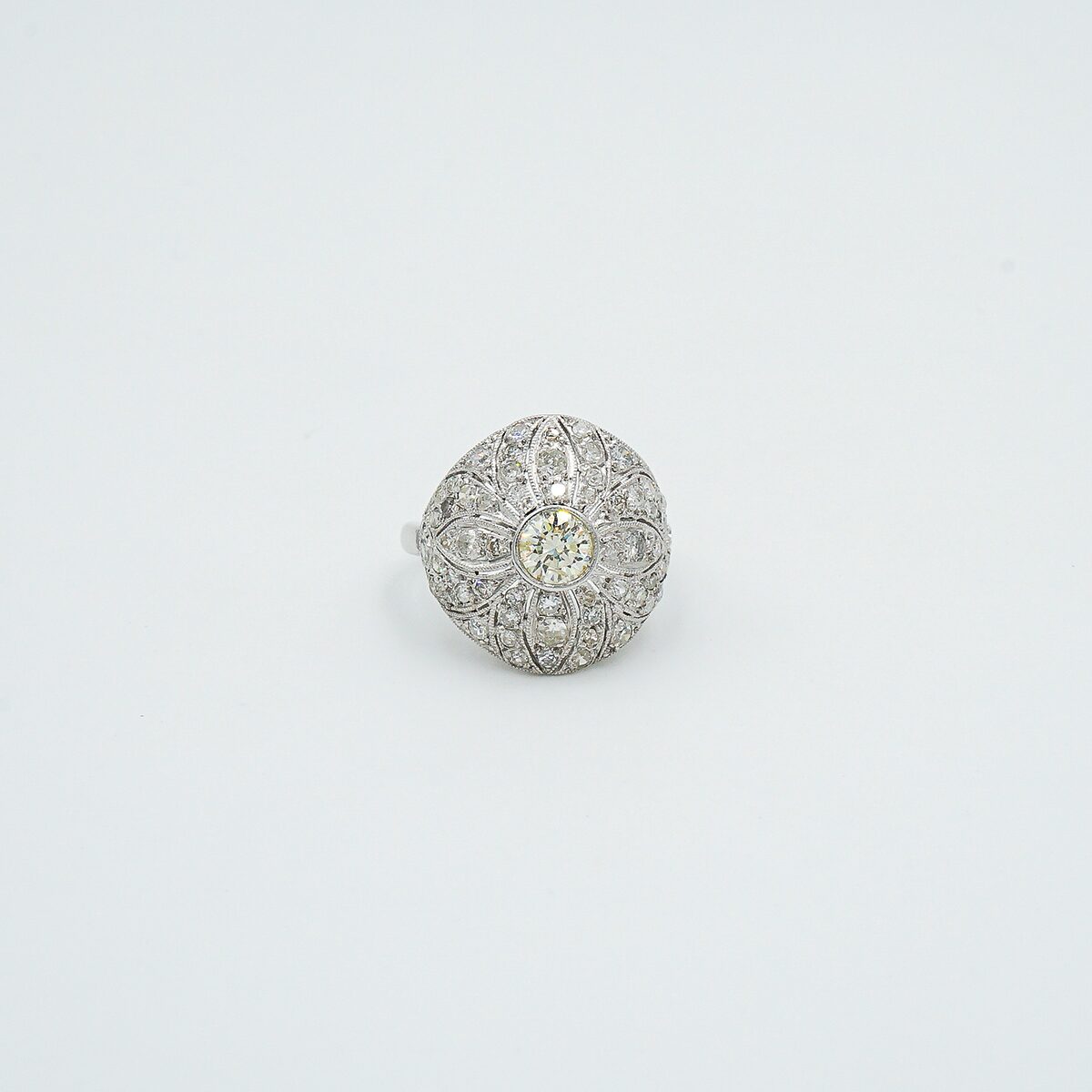 Anillo artdeco montado en platino con diamante central talla brillante de 0,70 color K pureza vs2 y pave de diamantes talla brillante.