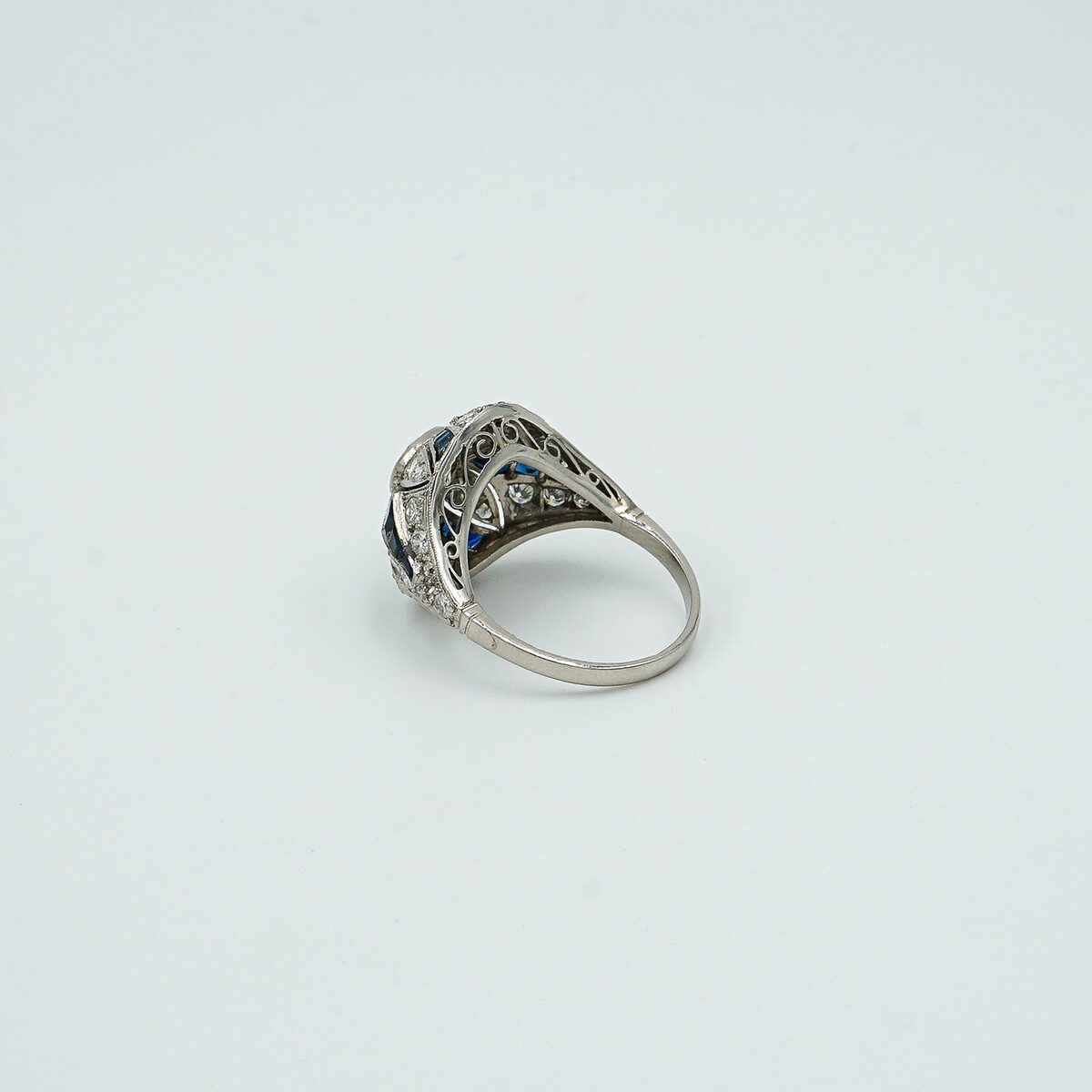 Anillo ART Déco Frances de los años 20 montado en platino con diamante central talla brillante antigua de 0,90 cts calibrado de zafiros y pave de diamantes talla brillante antigua.
