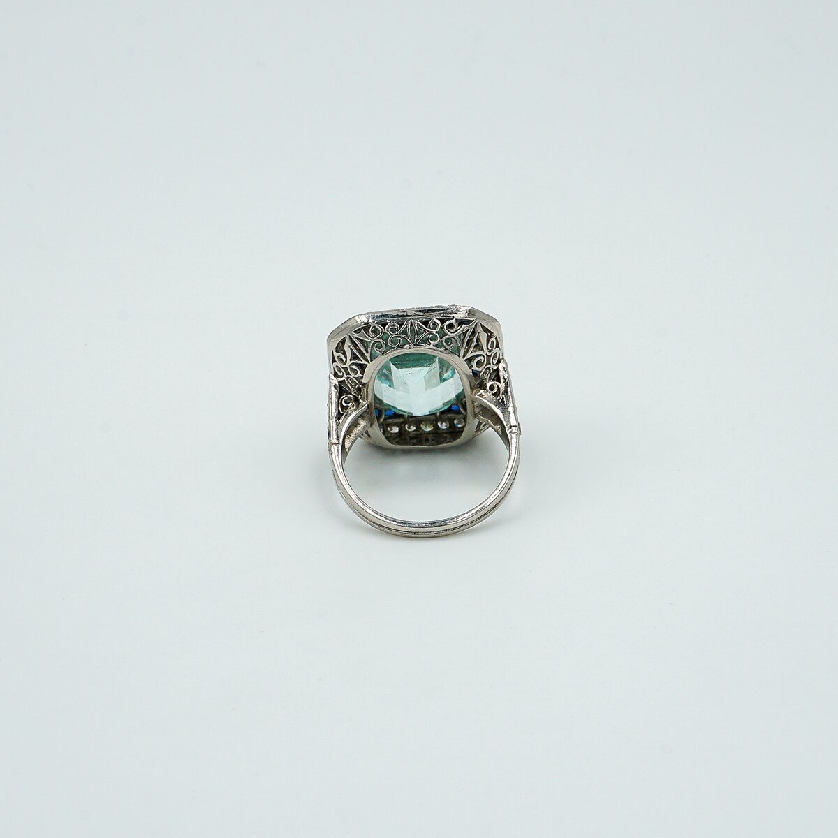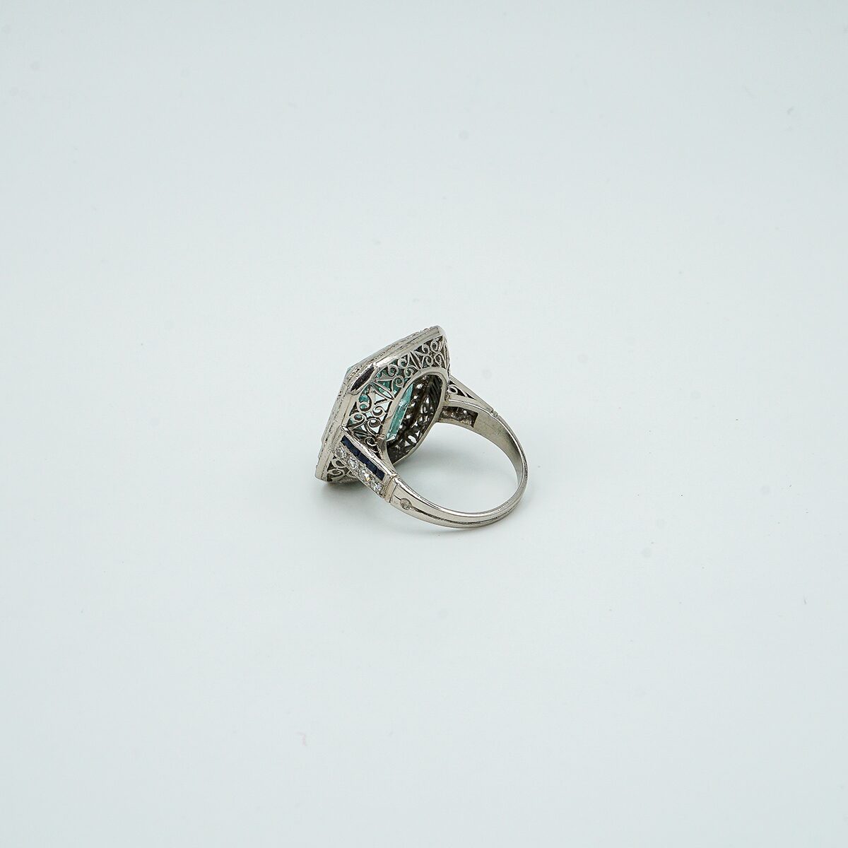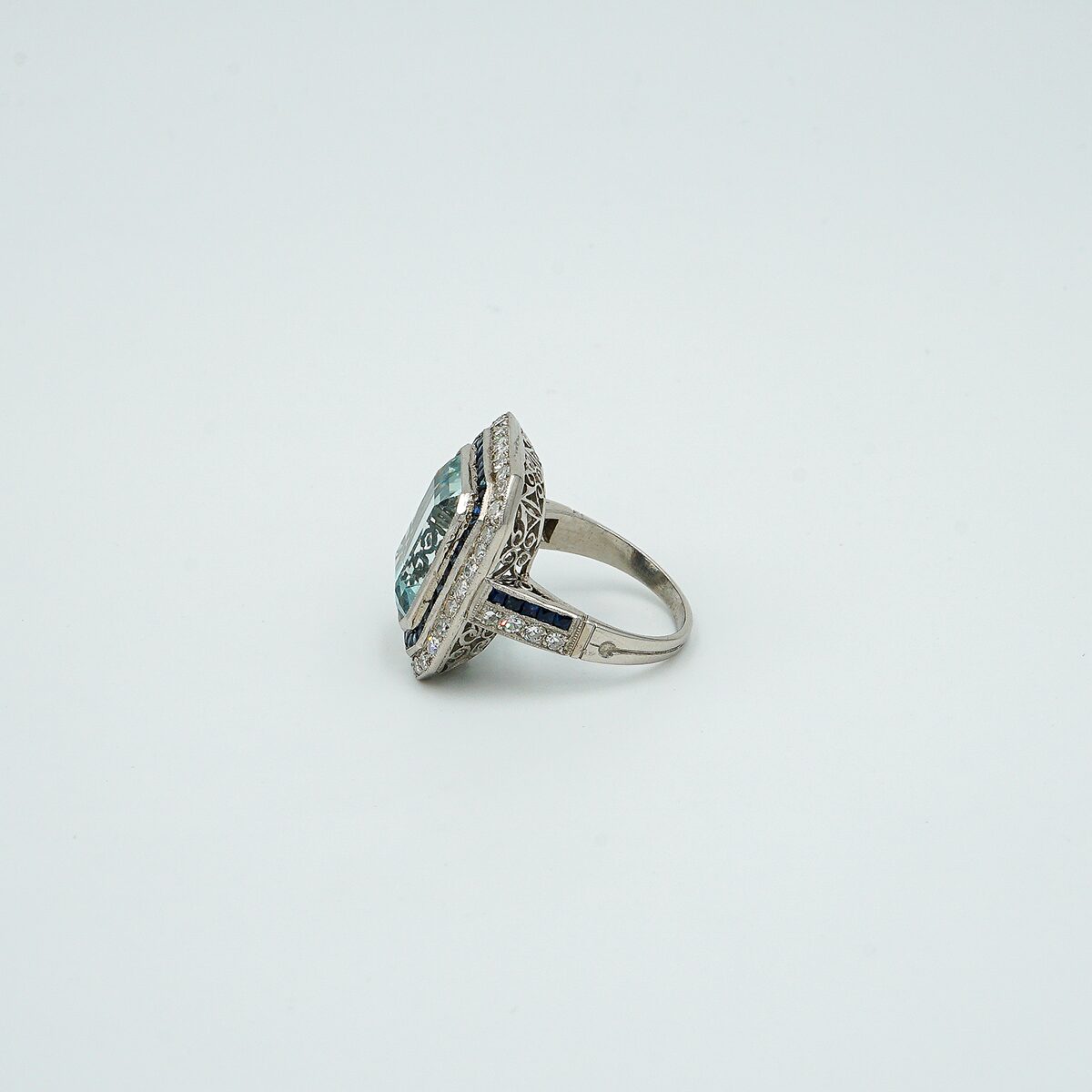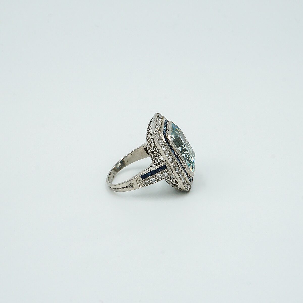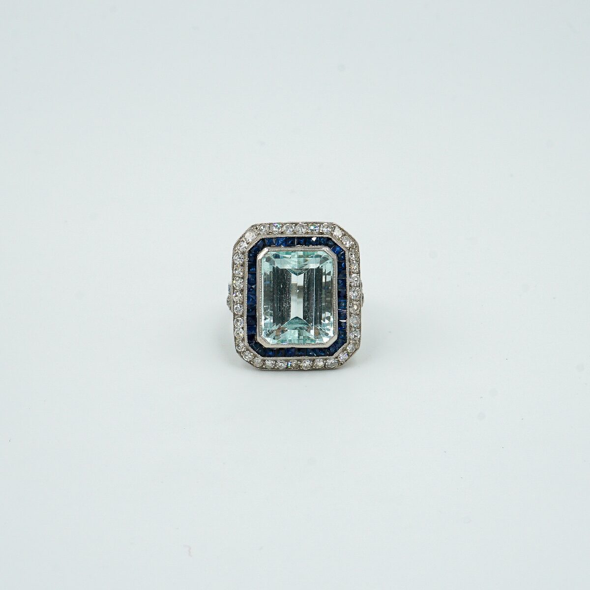 Sortija artdeco de los años 20 montada en platino con aguamarina central de 14 cts en talla esmeralda , orla de zafiros naturales calibrados y orla de diamantes talla brillante.