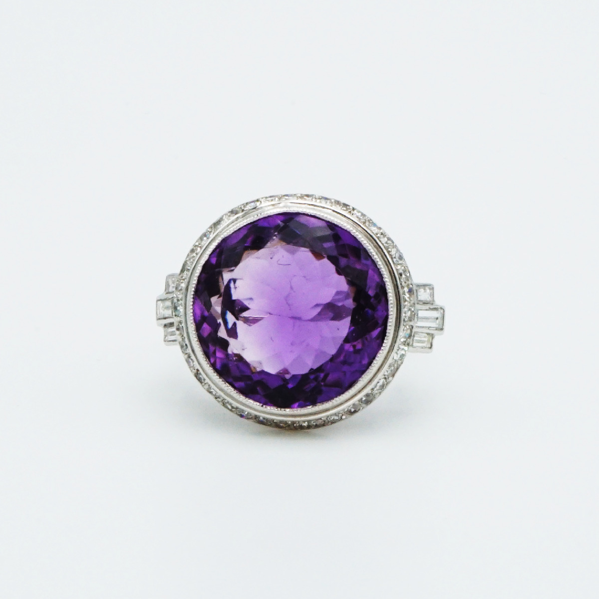 Anillo ART Déco con Amatista Natural en talla Brillante de 12 cts y orla de Diamantes