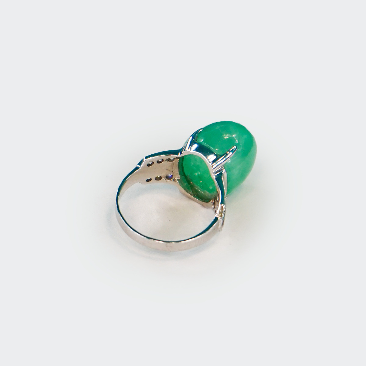 Anillo de oro blanco 18k con jade en forma de cabujon esmalte y diamantes.