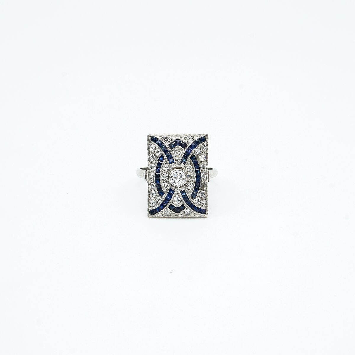 Anillo artdeco de platino con pave de diamantes talla brillante y formacion geometrica de zafiros naturales en talla carre.
