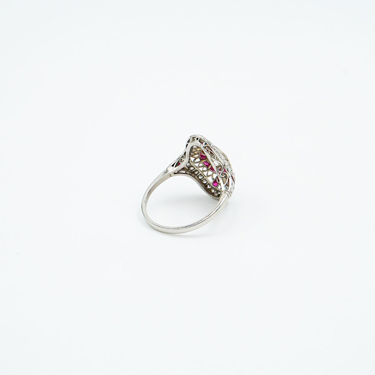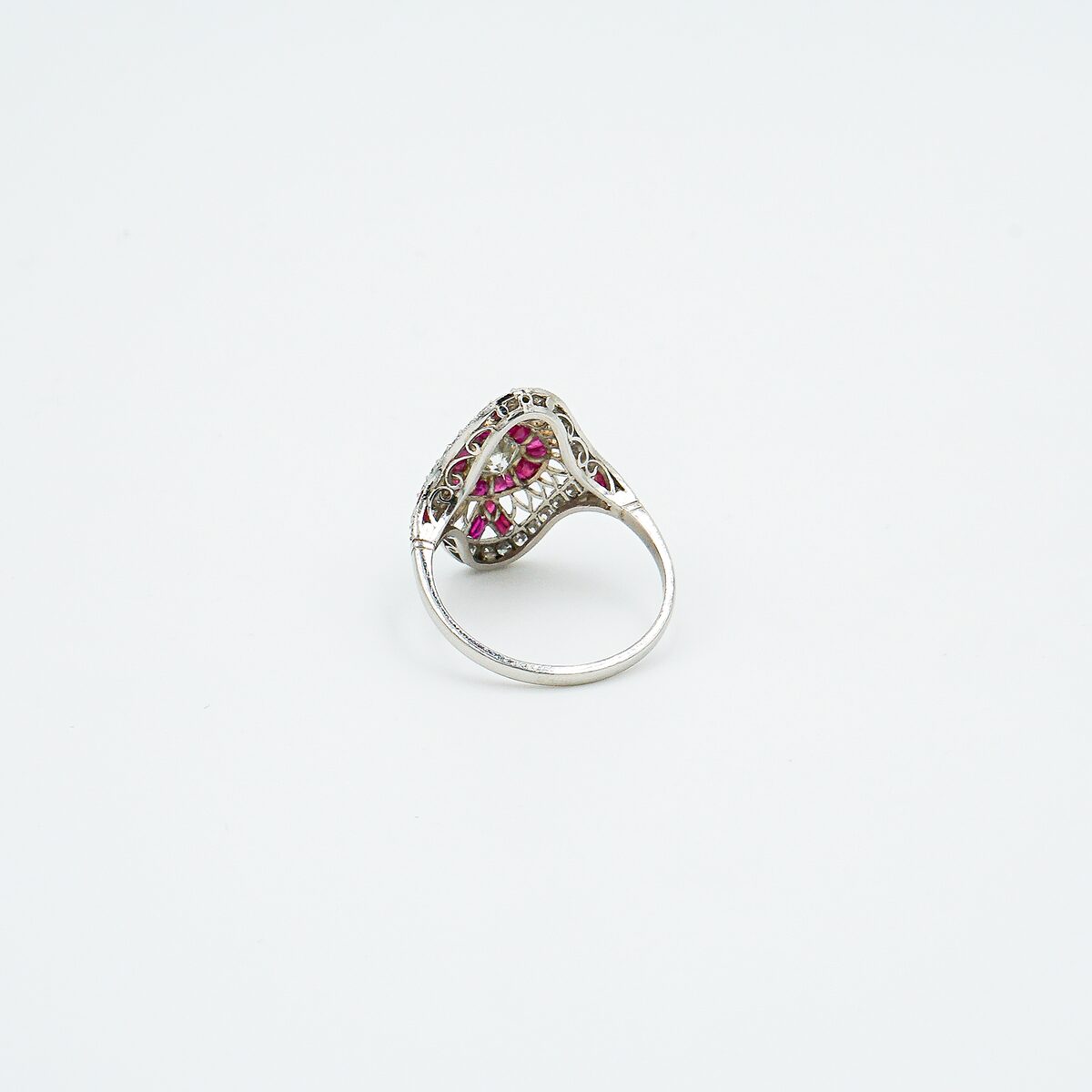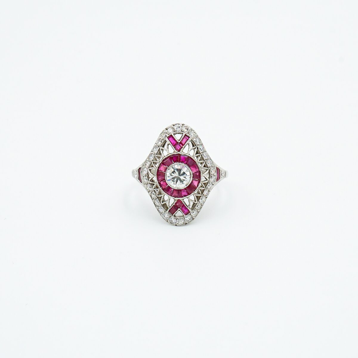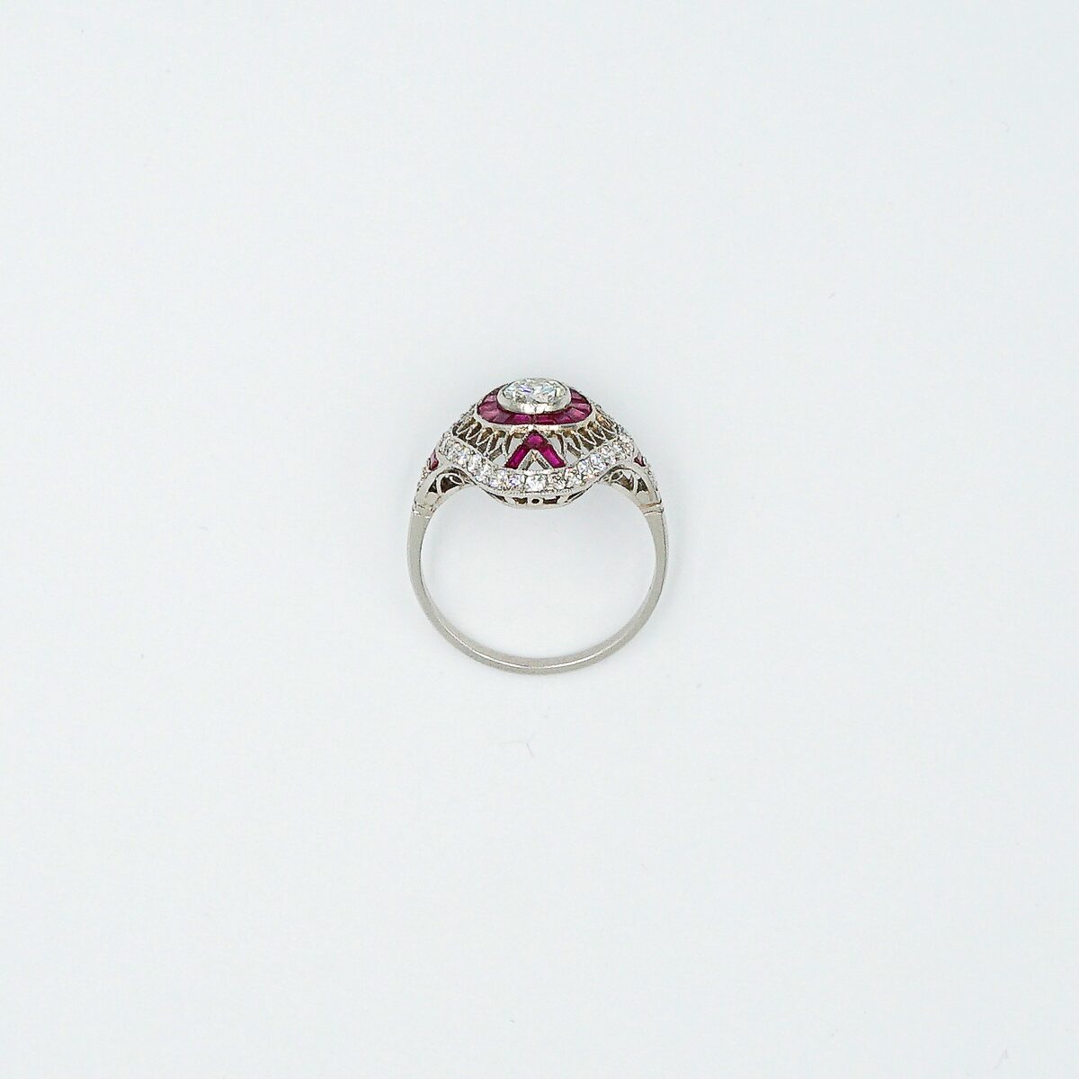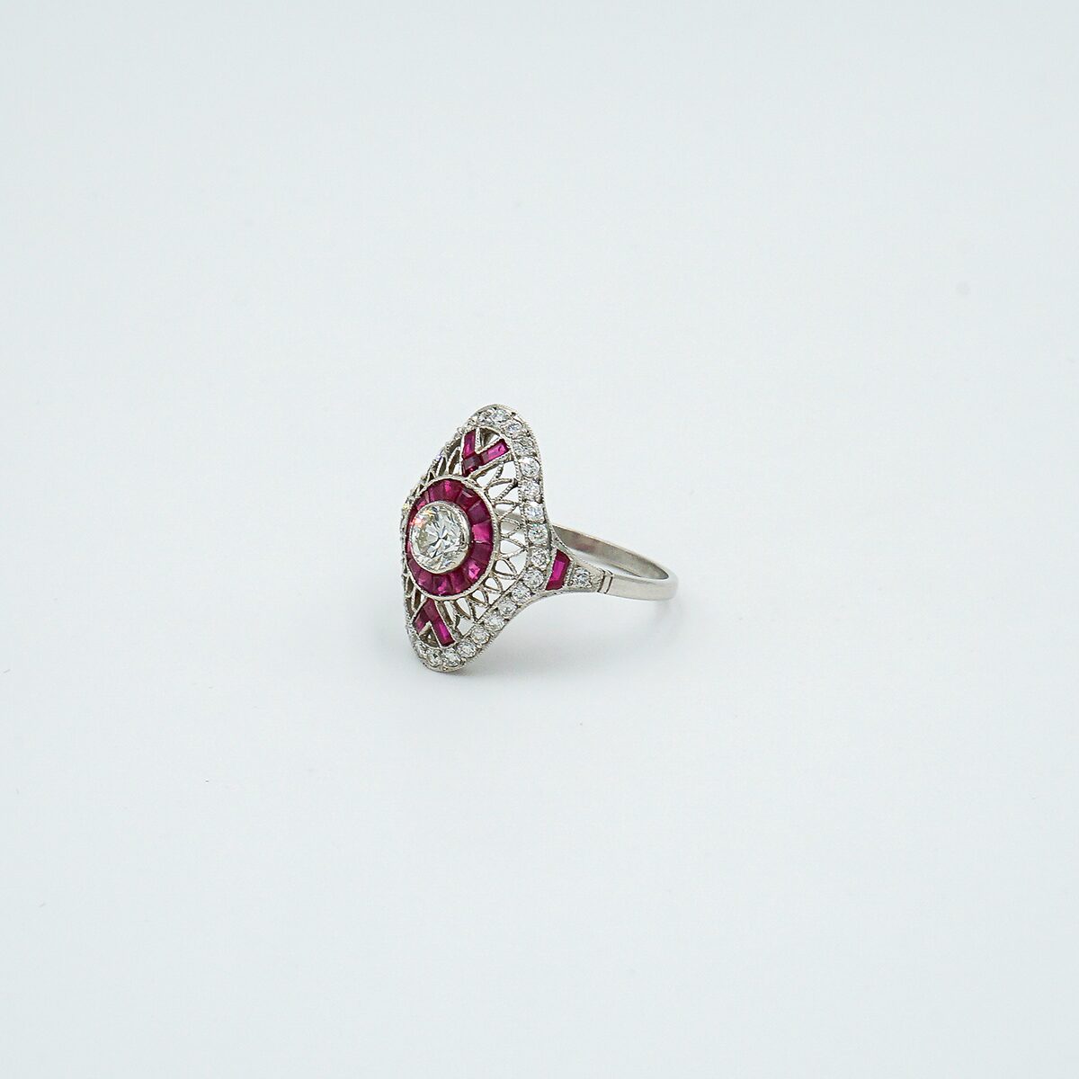 Anillo lanzadera artdeco montado en platino con diamante central talla brillante de 0,60 color G pureza vs1 y orla de rubies naturales de origen Birmania y doble orla de diamantes talla brillante.