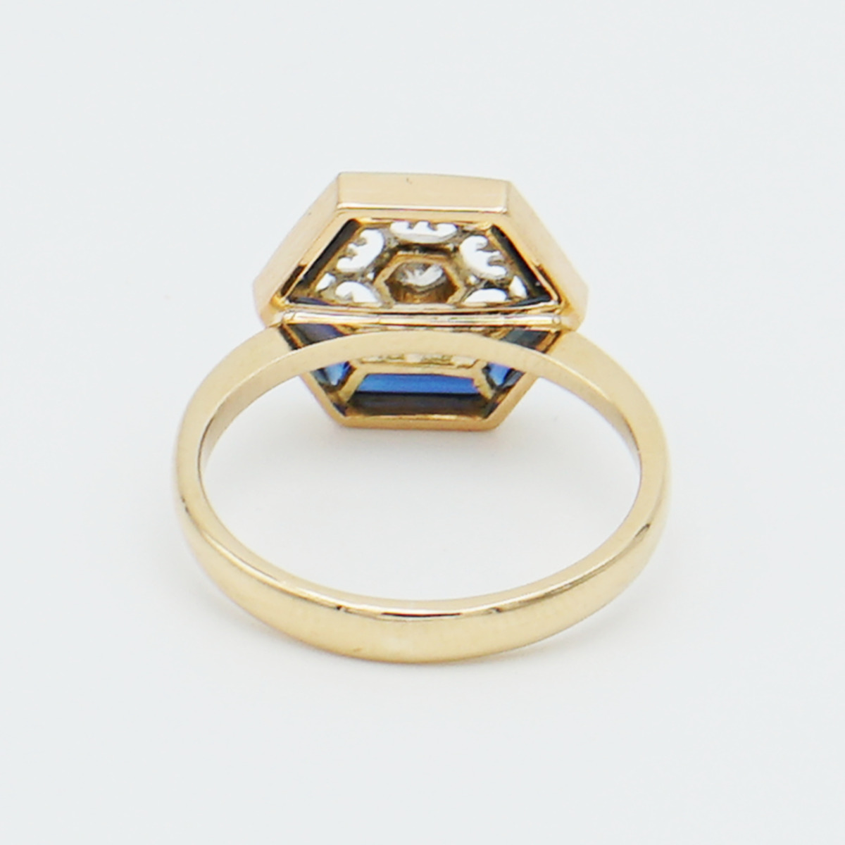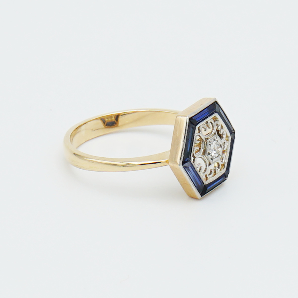 Anillo artdeco de oro de 18k y vistas de platino con diamante central de 0.10 cts color G pureza vs2 trabajo en platino calado y orla octogonal de zafiros en talla baguette.