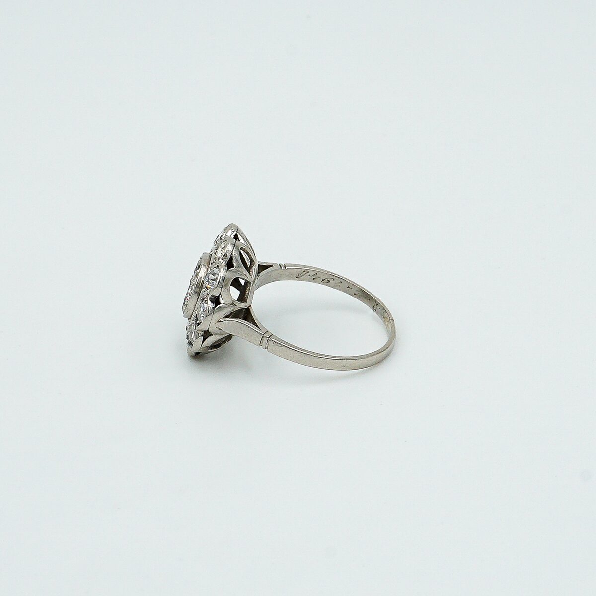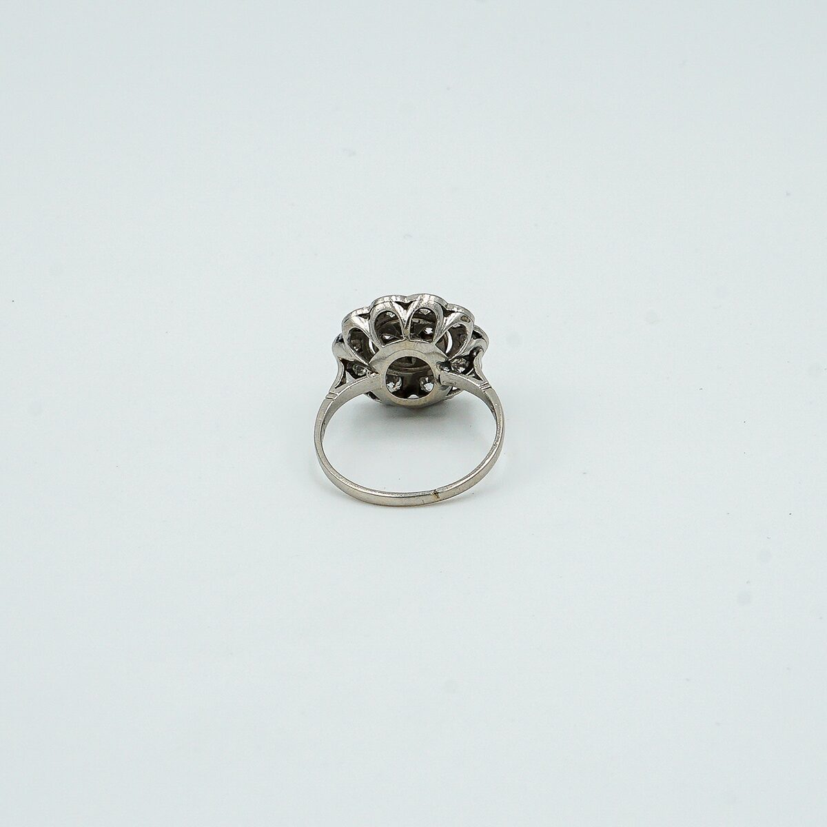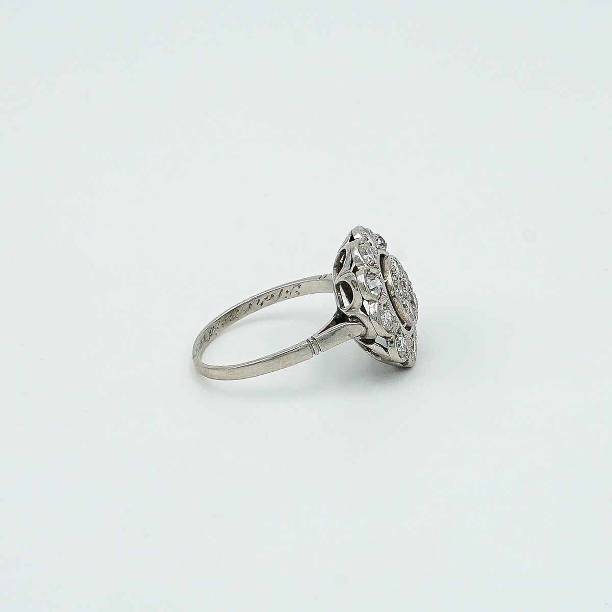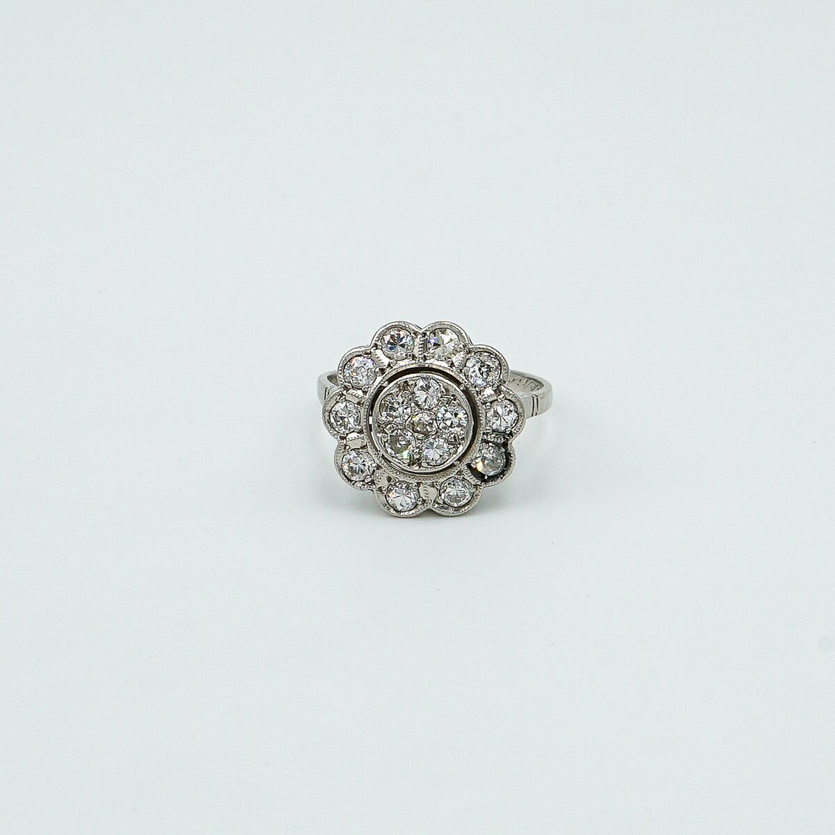 Anillo artdeco tipo roseta con pave de diamantes y orla todos en talla brillante antigua con un peso total de 1.20 cts.