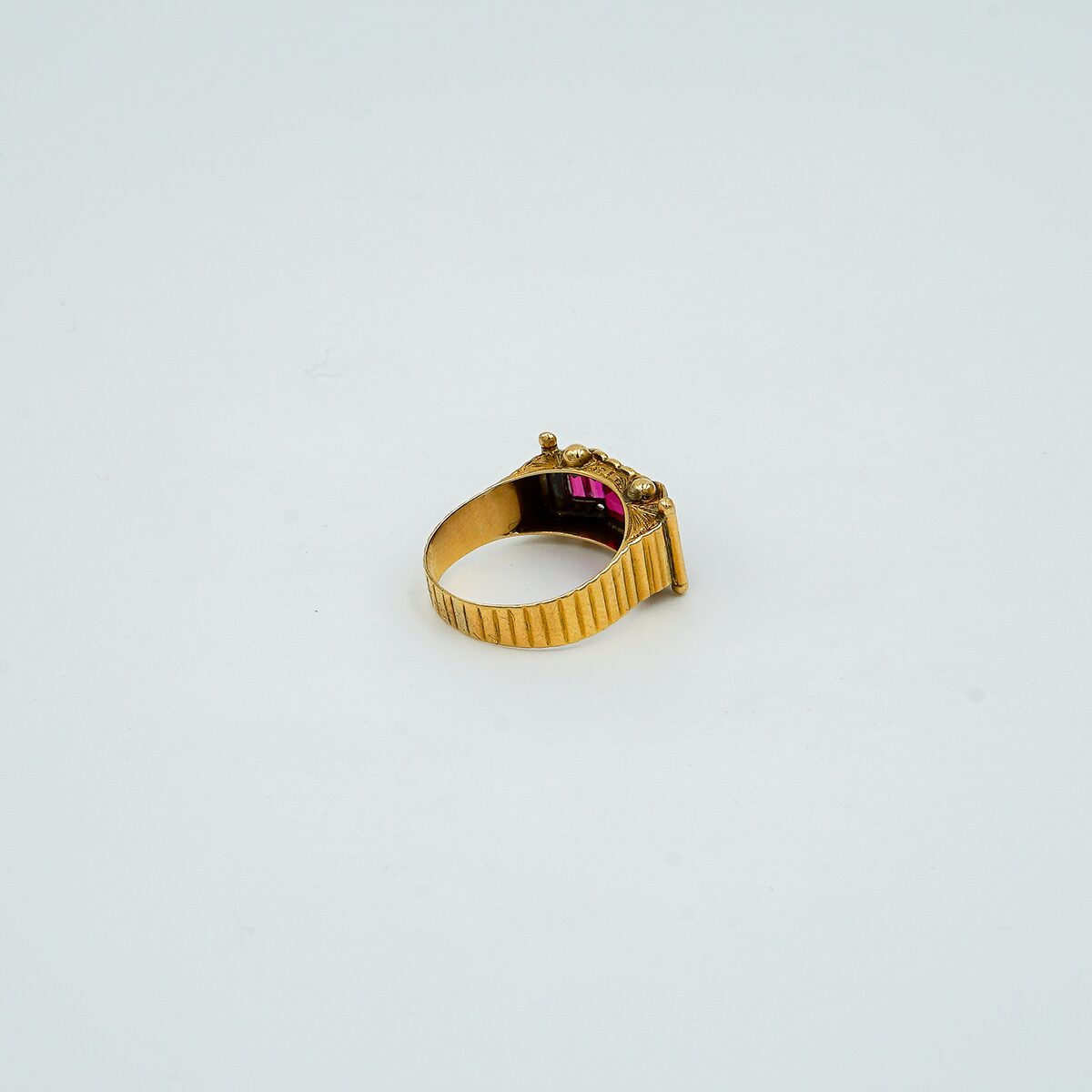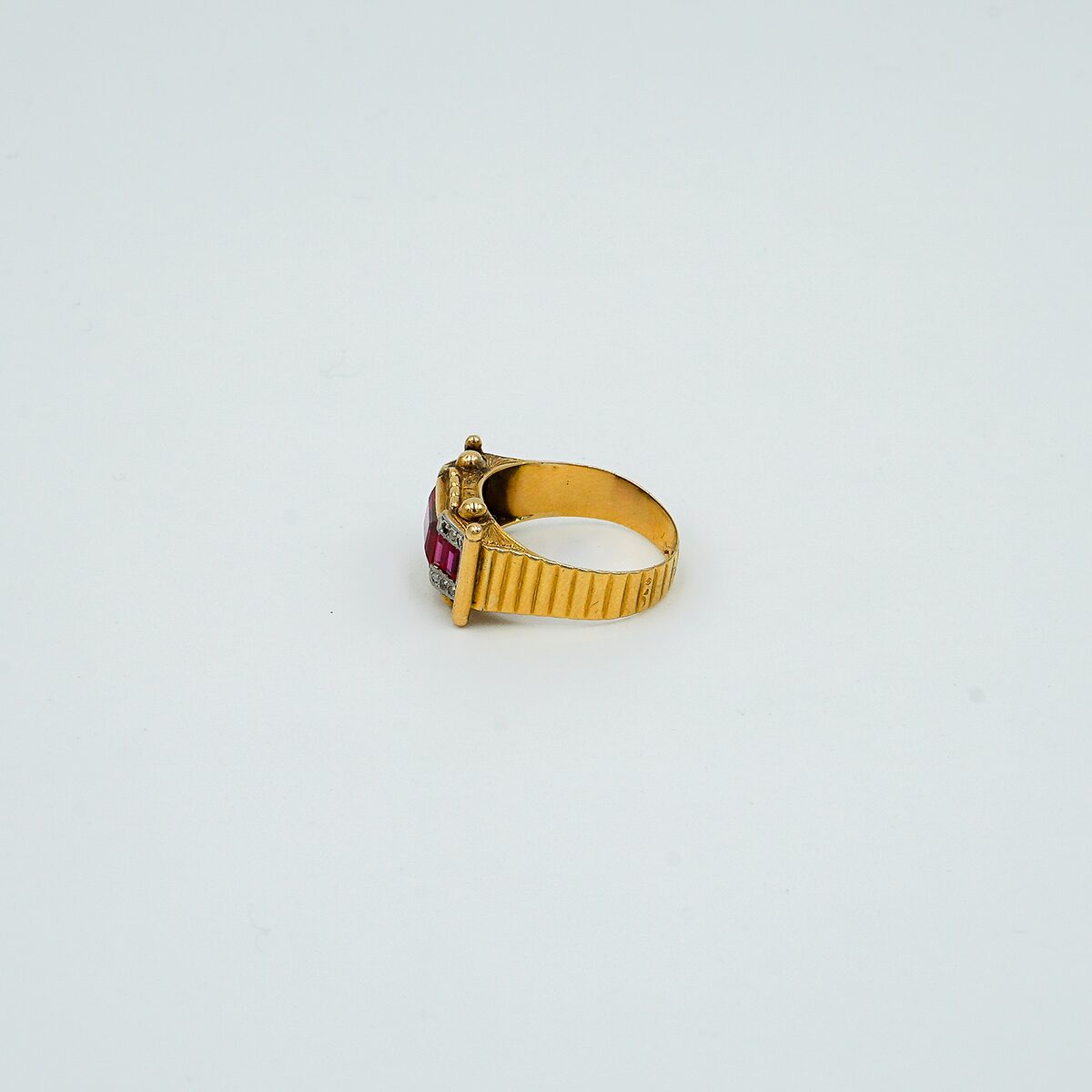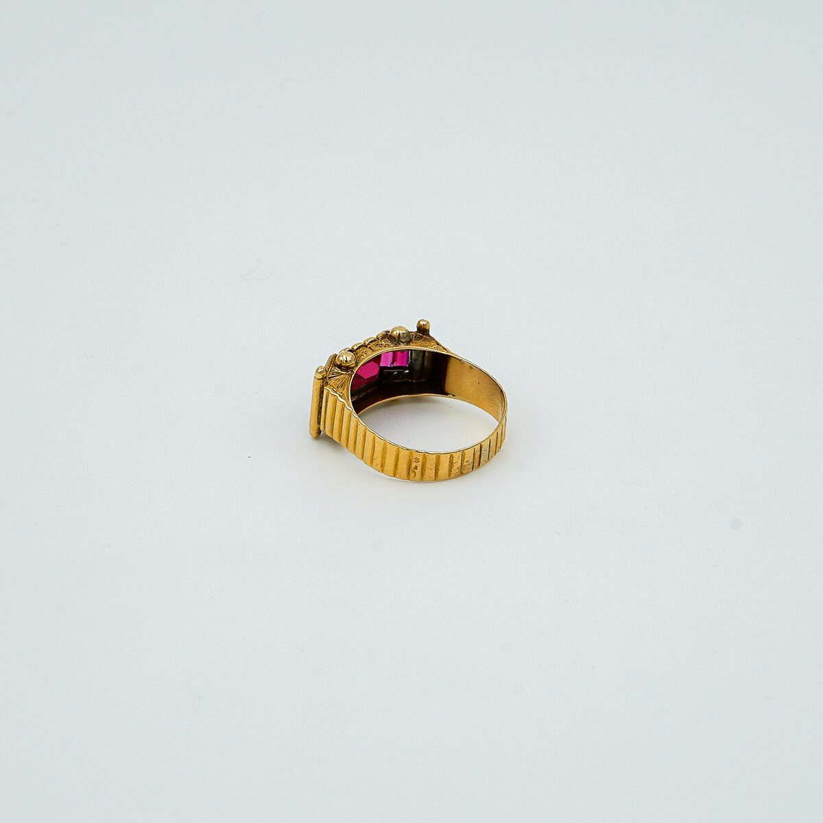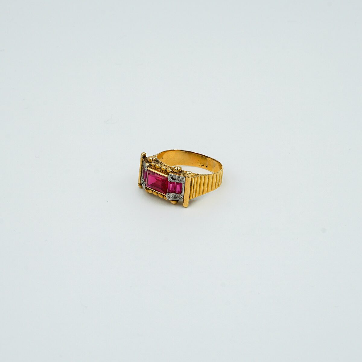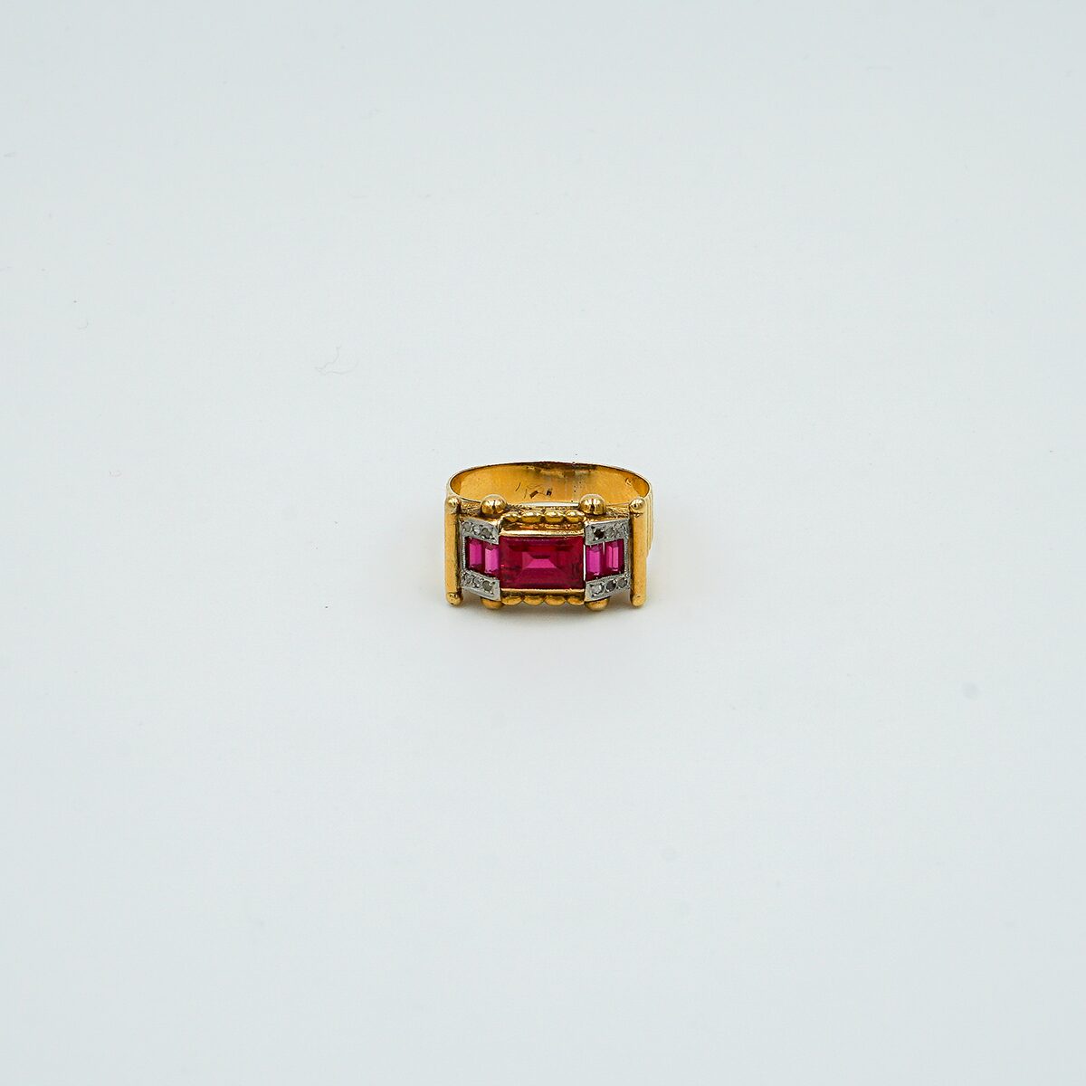Anillo chevalier montado en oro de 18k con diamantes talla brillante antigua y rubies sinteticos.