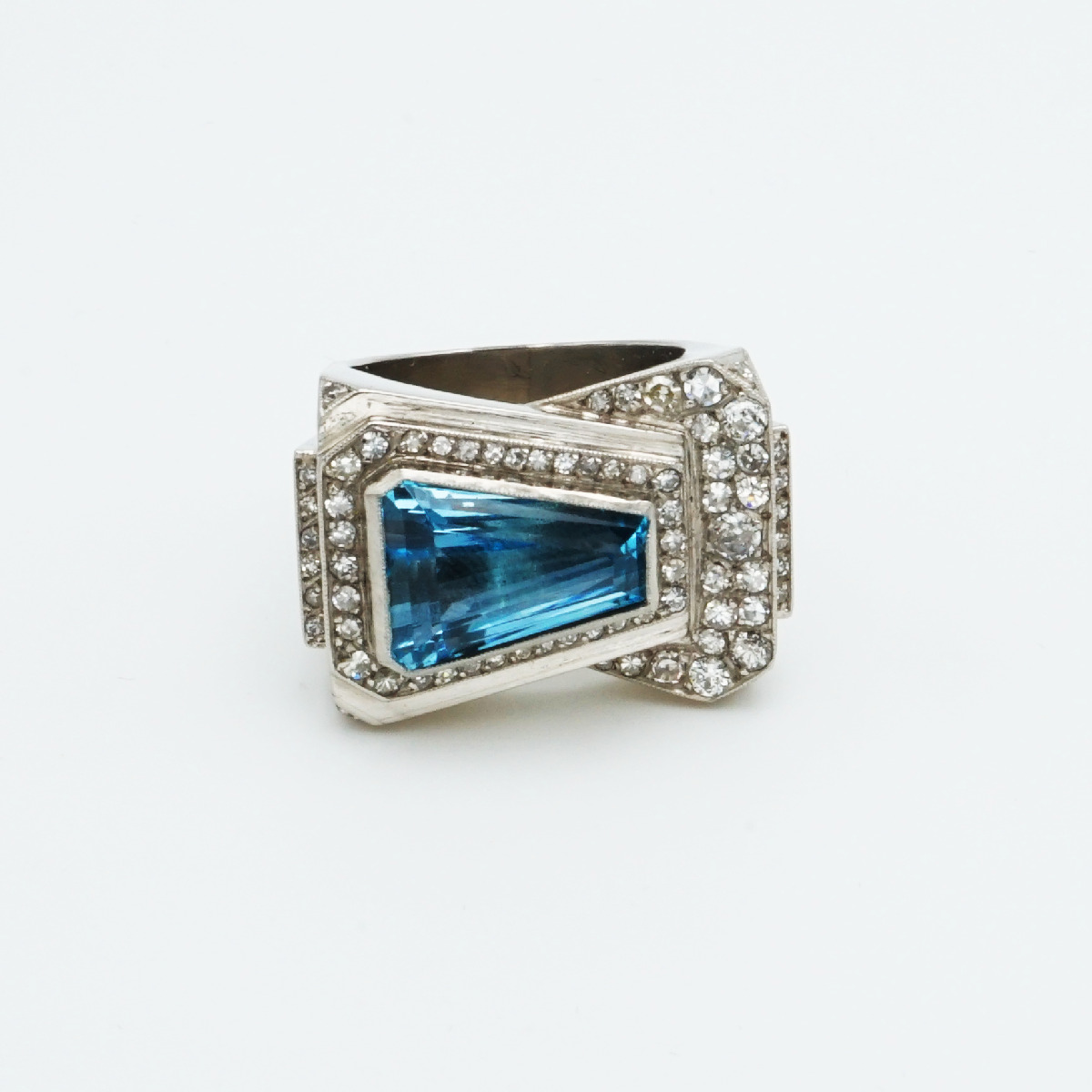 Sortija de platino de estiló Chevalier con topacio azul central y pave de 67 diamantes talla brillante 1.80 cts.