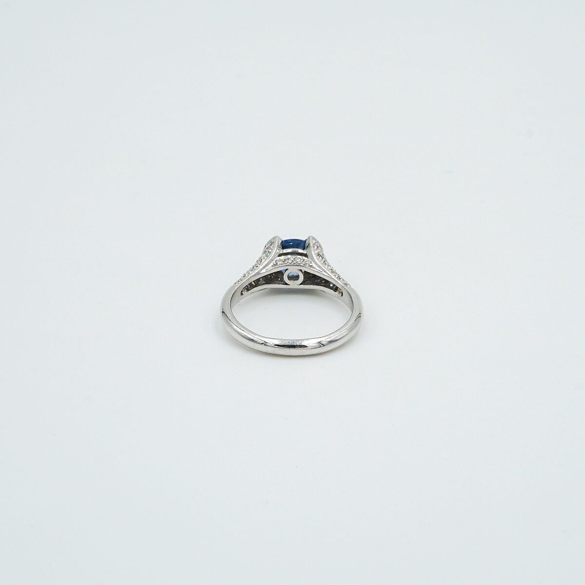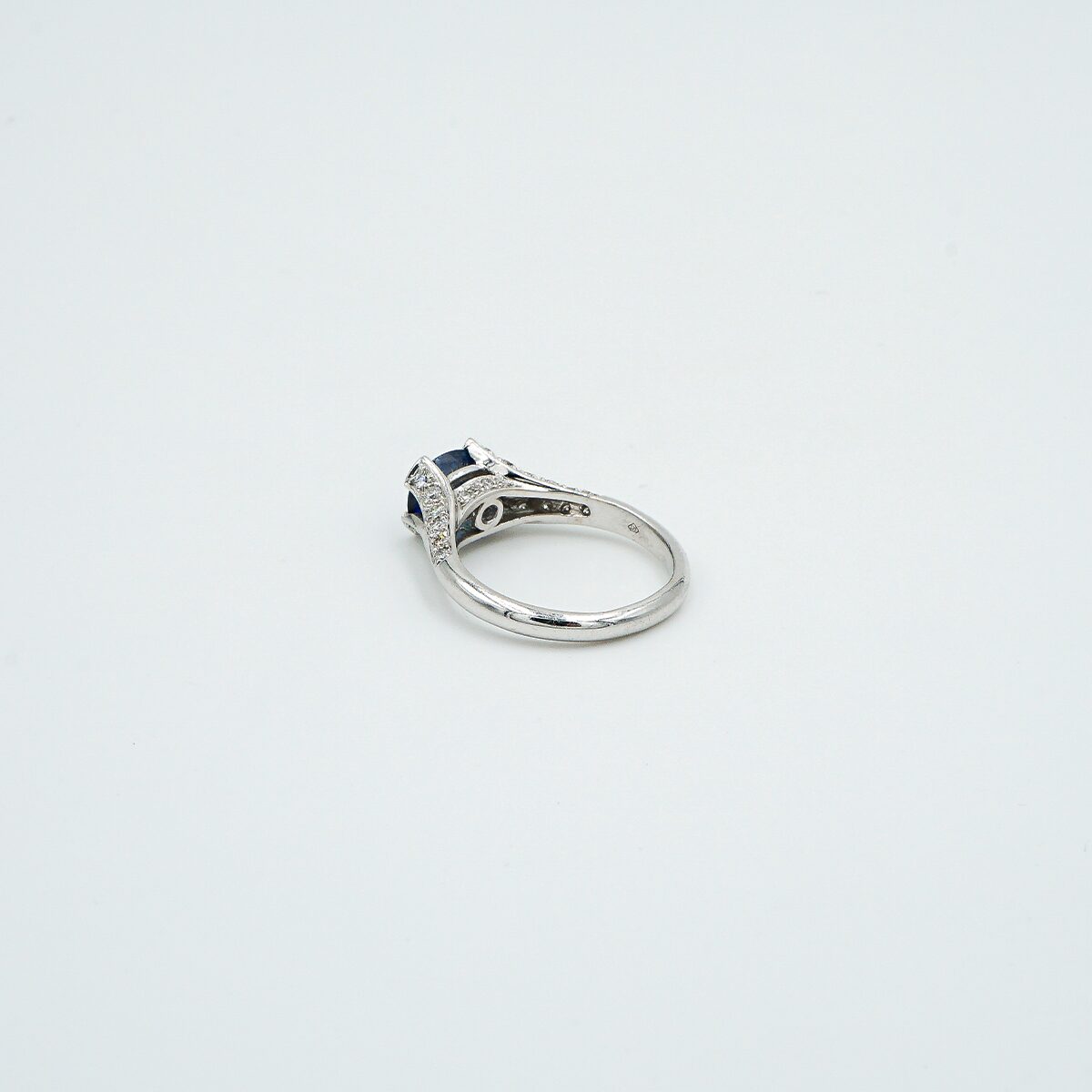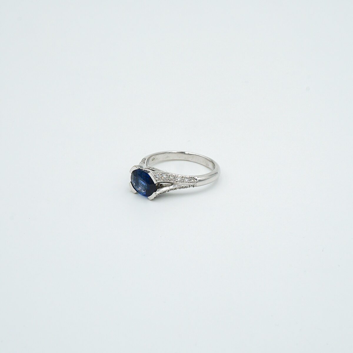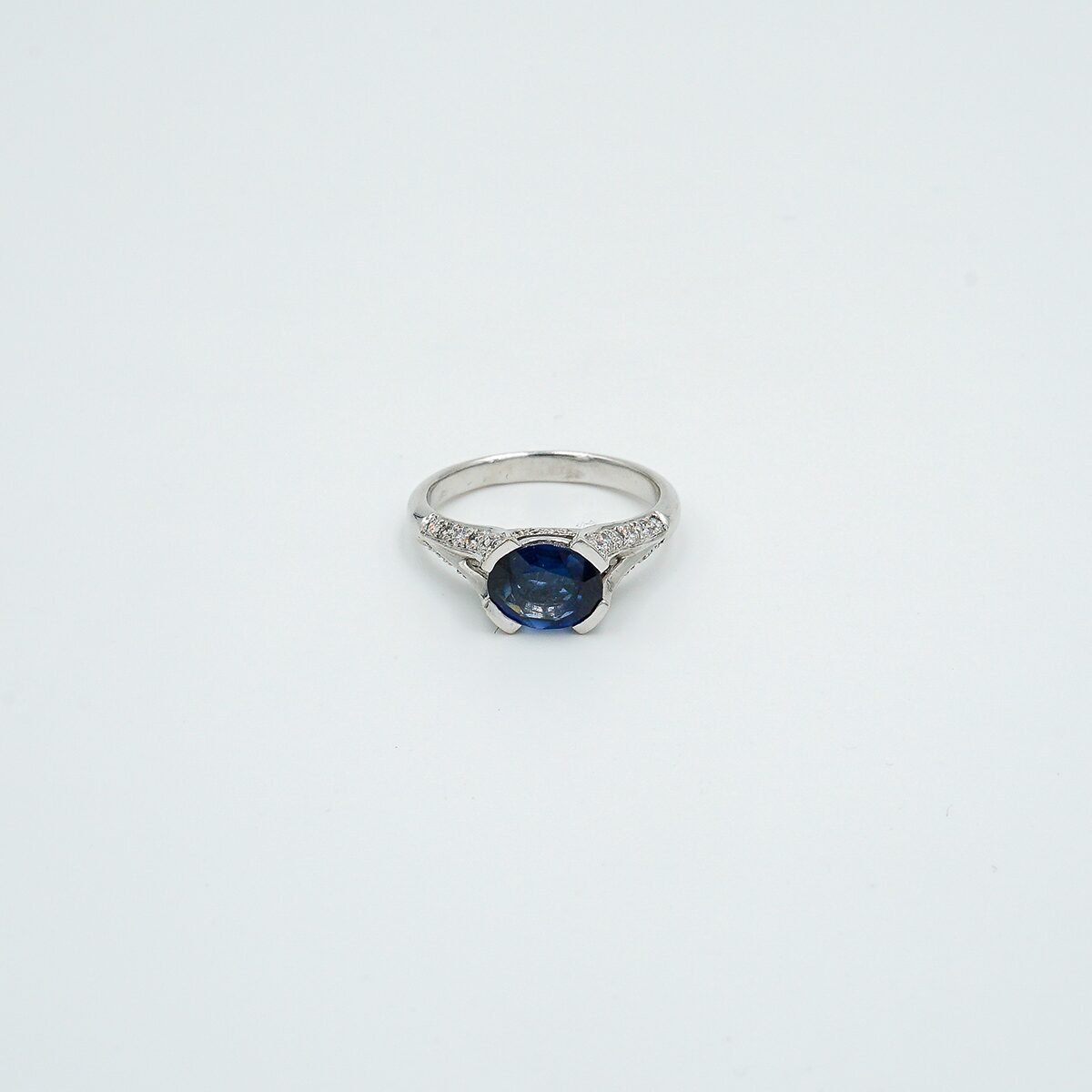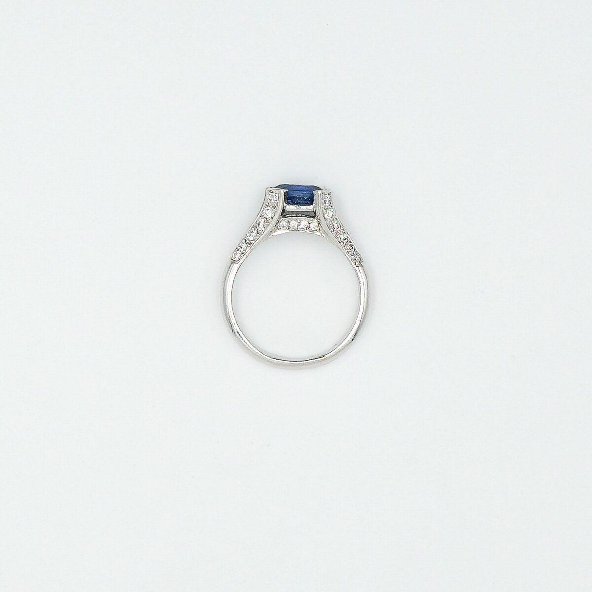 Anillo de oro blanco de 18k con zafiro central en altura de 2,70 cts y pave de diamantes talla brillante de color G pureza vs1 de los años 80.