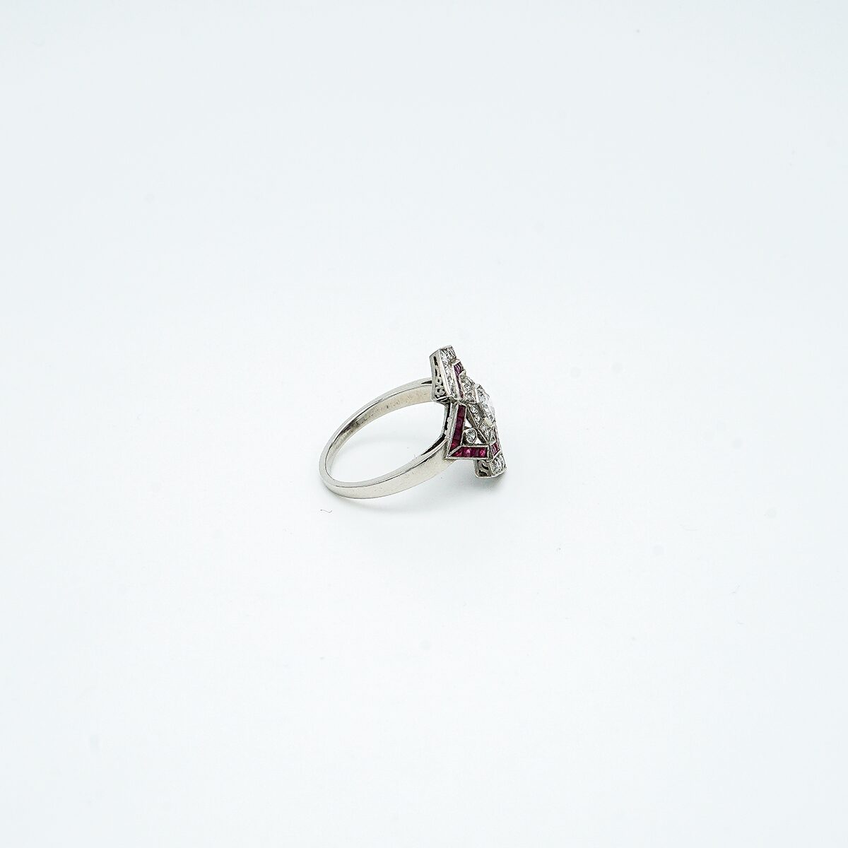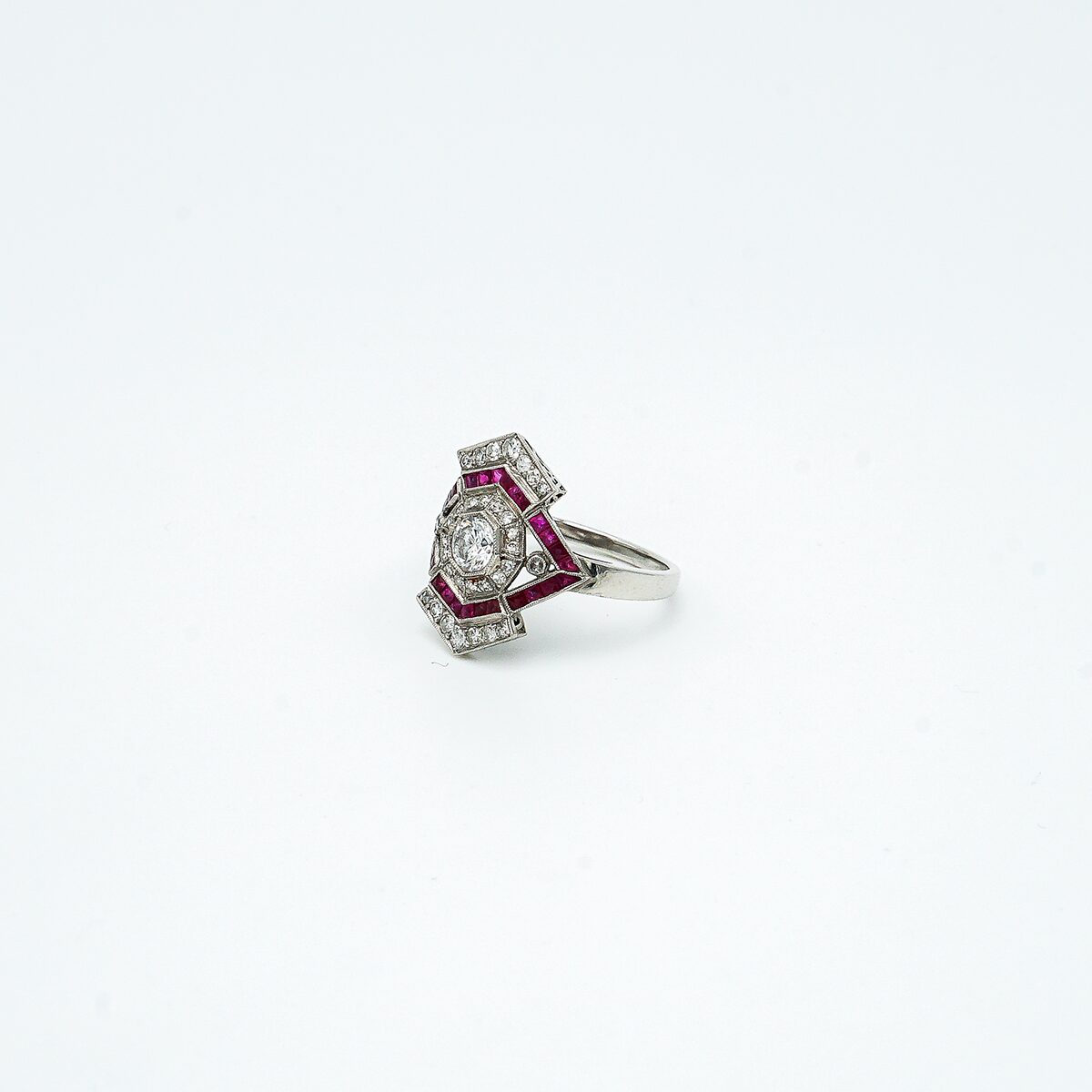 Sortija artdeco de los años 20 montada en platino con diamante central de 0,50 cts color H pureza vs2 pave de diamantes con un total de 0,60 cts con terminacion es en calibrado de rubies calibrados.
