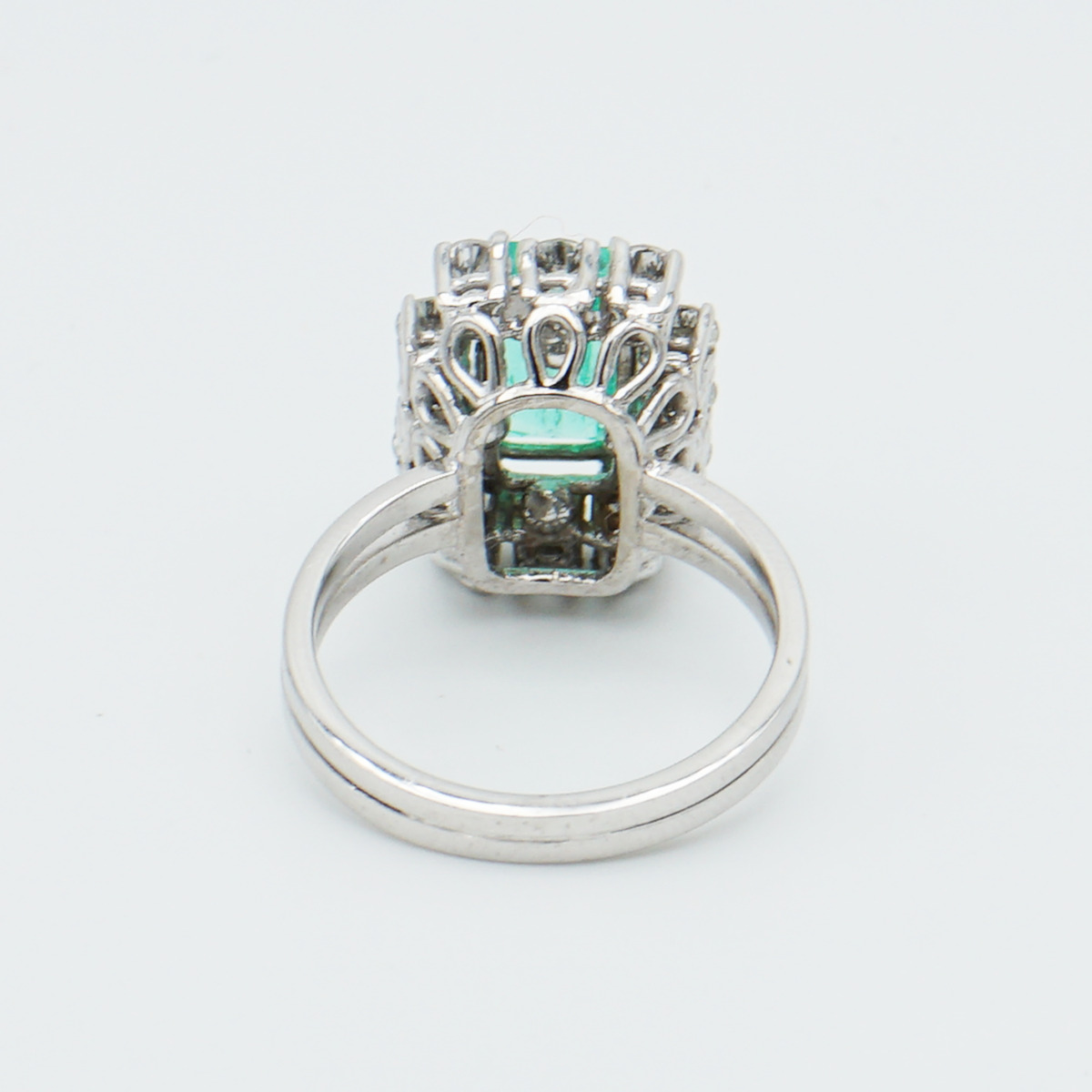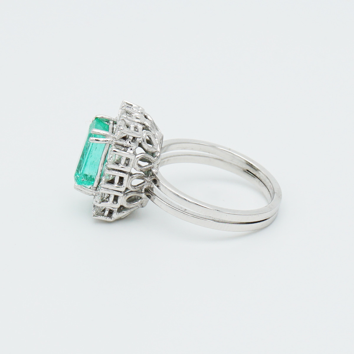 Sortija de los años 50 montada en oro blanco de 18k con esmeralda colombiana de 2,80 cts y orla de diamantes talla brillante.
