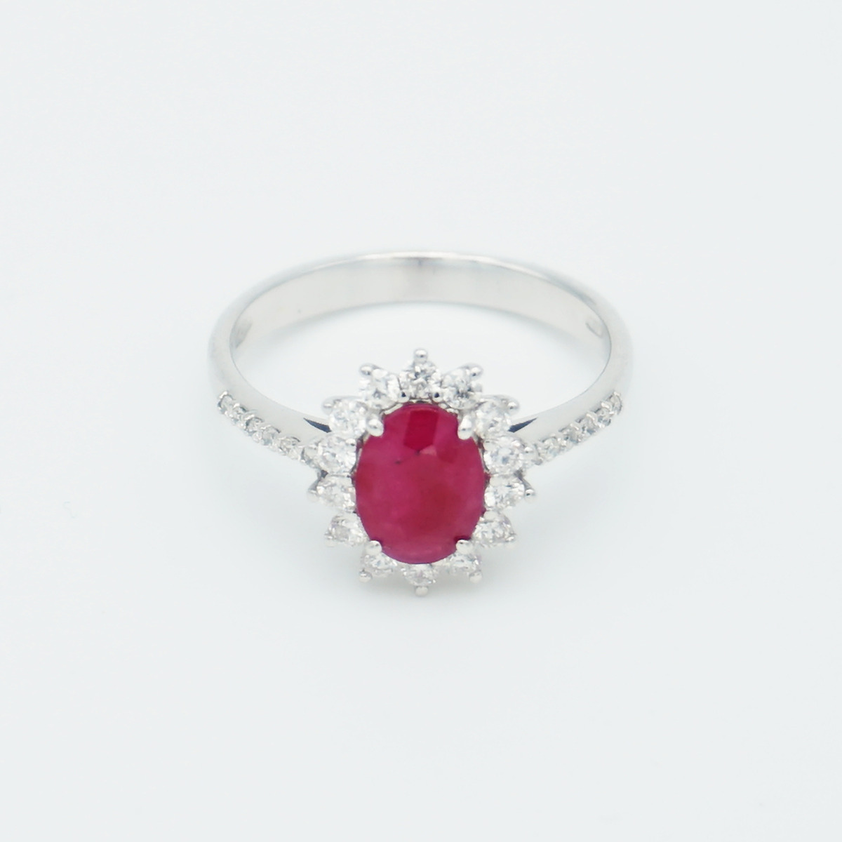Oro blanco 18k con orla de diamantes talla brillante (0,82 cts) y rubi natural de 1.48 cts.
