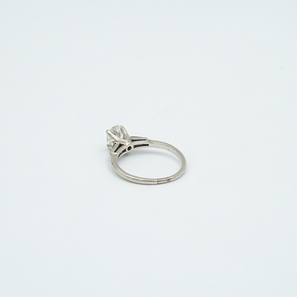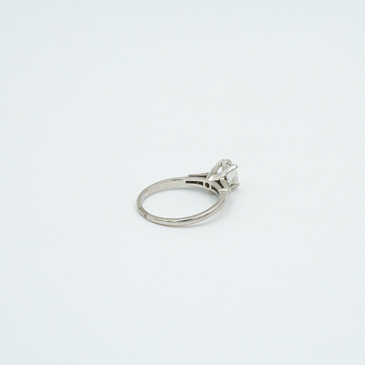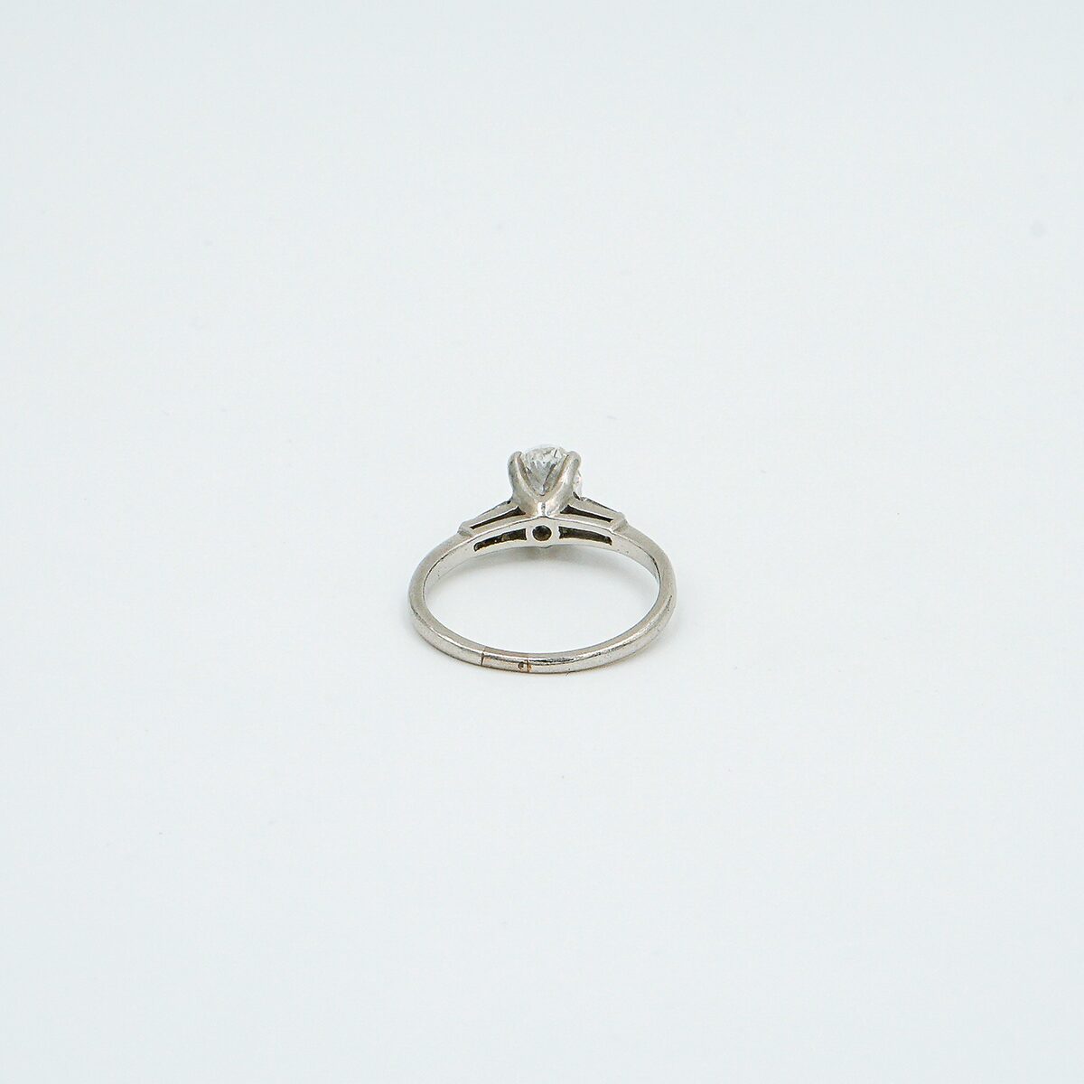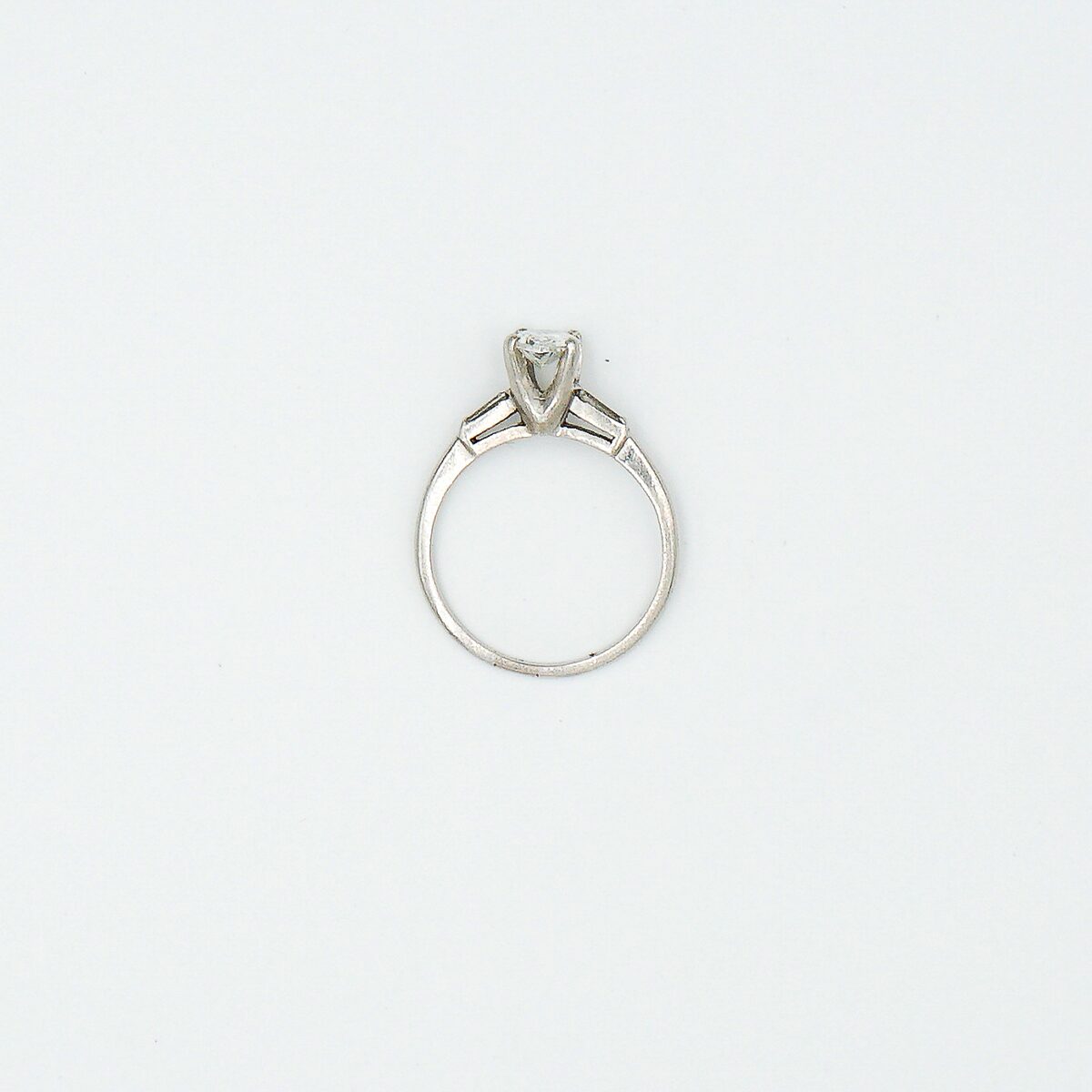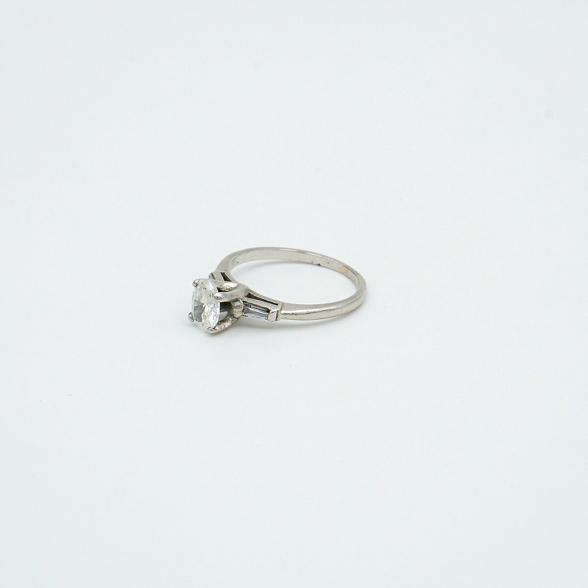 Anillo solitario montado en oro blanco de 18k con diamante central de 0,80 cts en talla oval color H pureza vs2 y dos diamantes a los lados en talla baguette.