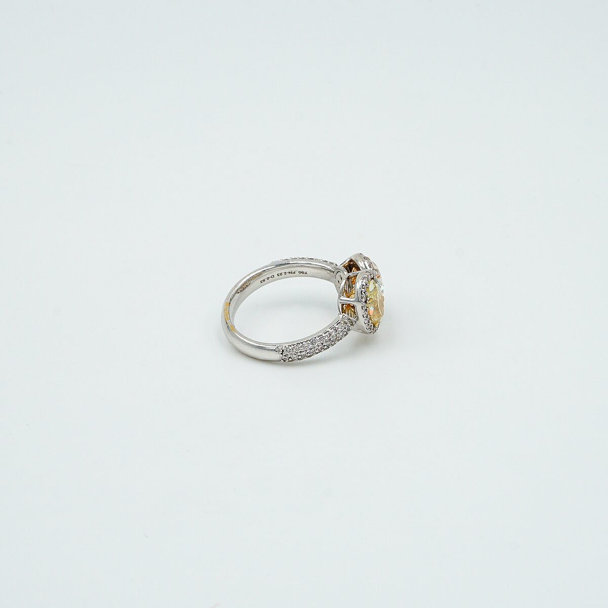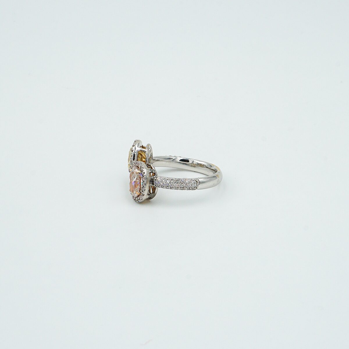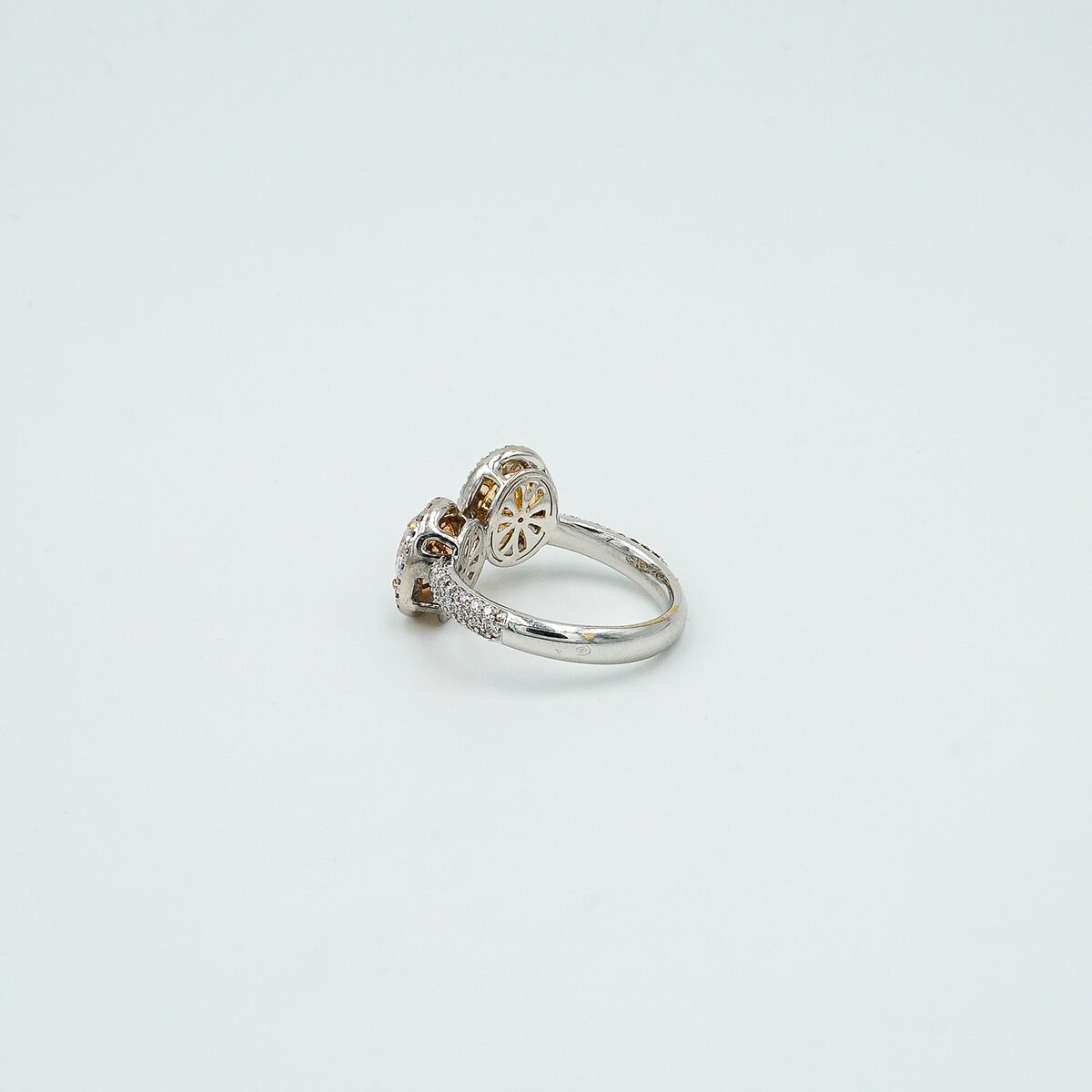 Anillo tu y yo montado en oro blanco de 18k con dos diamantes fancy ( amarillo 1.10 cts – rosa 1.10cts ) en talla oval y con orla de diamantes talla brillante.
