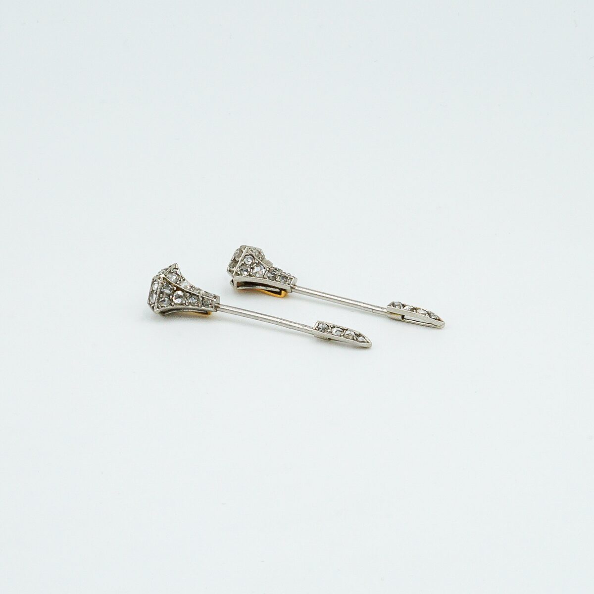 Espectacular pareja de jabot Cartier firmados y contrastados de los años 20 montados en oro de 18k y platino con diamantes talla brillante antigua.
