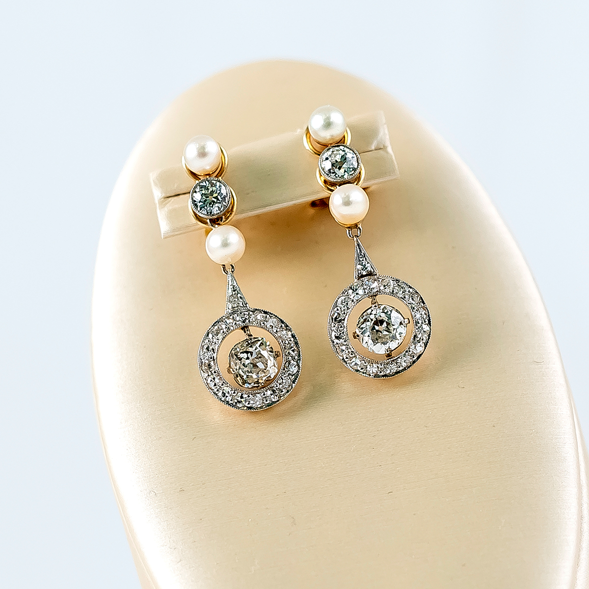 Montados en oro amarillo de 18k y engastes de platino diamantes centrales de 1.10 cts. cada uno orleados con diamantes talla brillante y perlas.