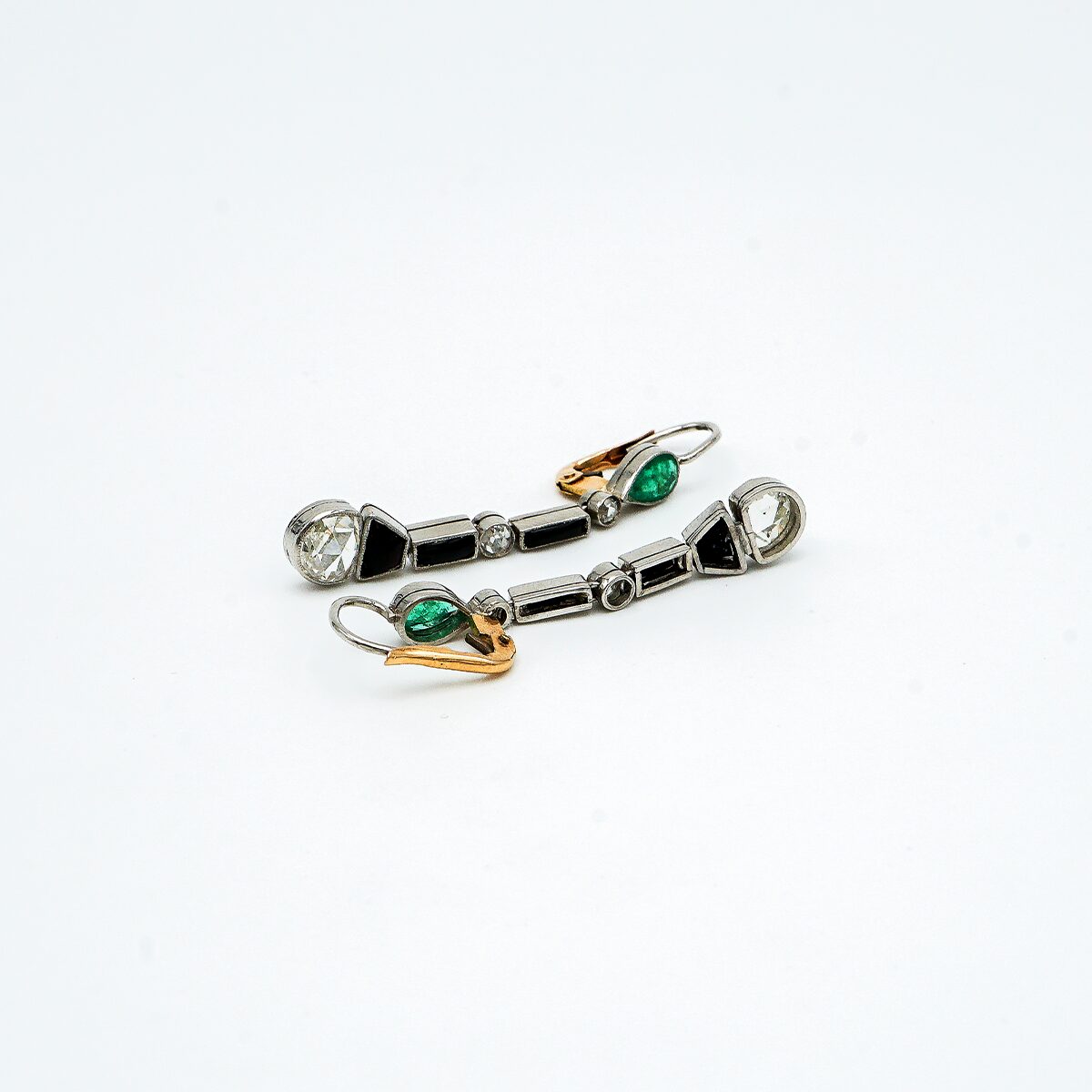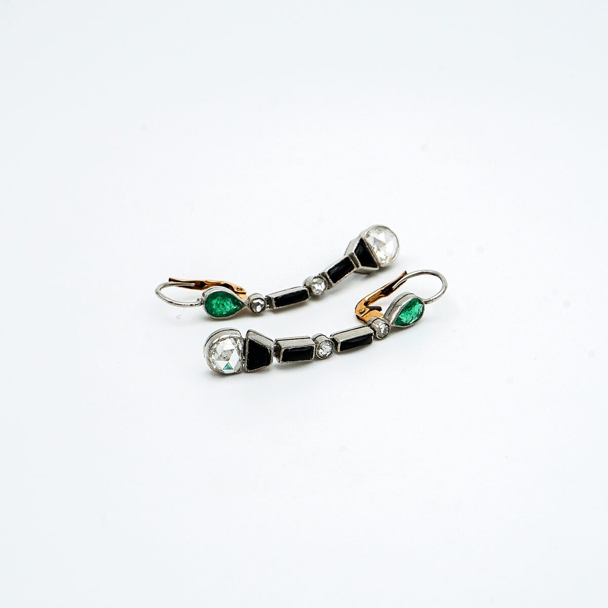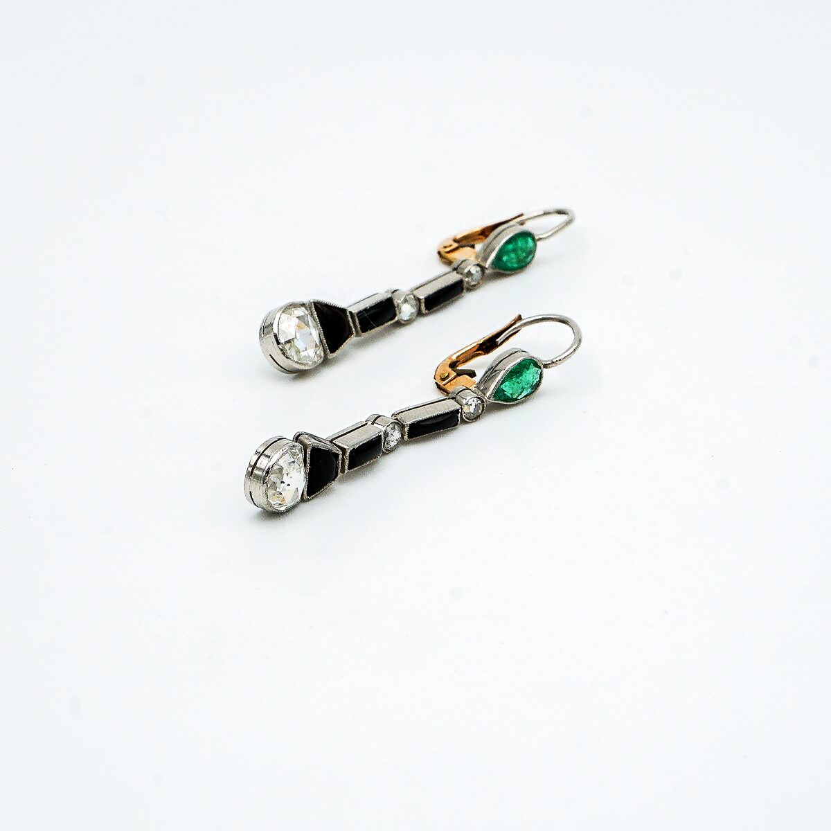 Pendientes artdeco de platino con diamantes talla rosa de 0,80 cts cada una esmeraldas colombianas y onix.