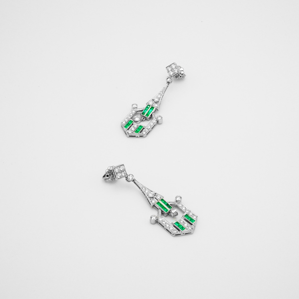 Pendientes montados en platino de los años 20 artdeco con 50 diamantes talla brillante(2.30 cts) y calibrado de esmeraldas colombianas.