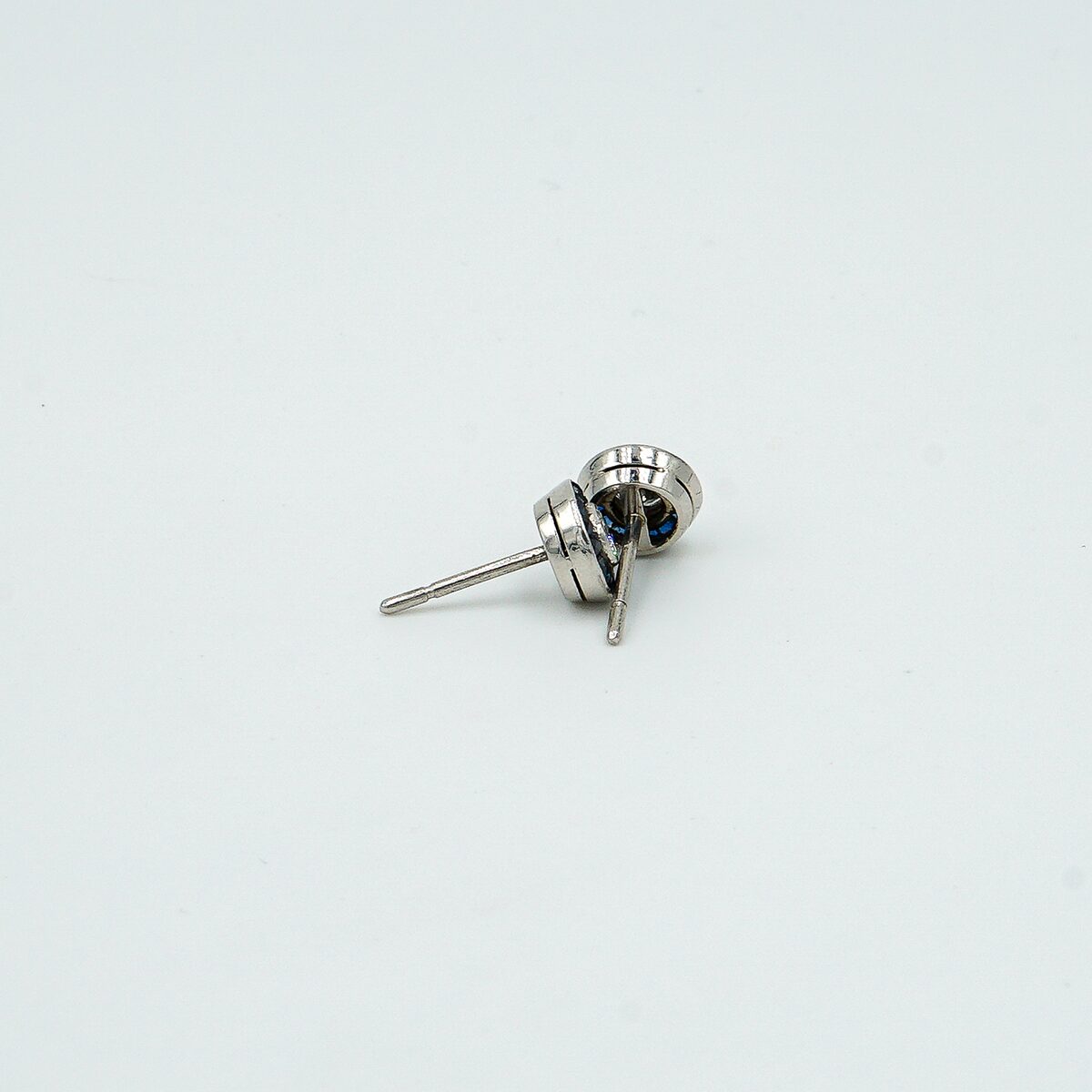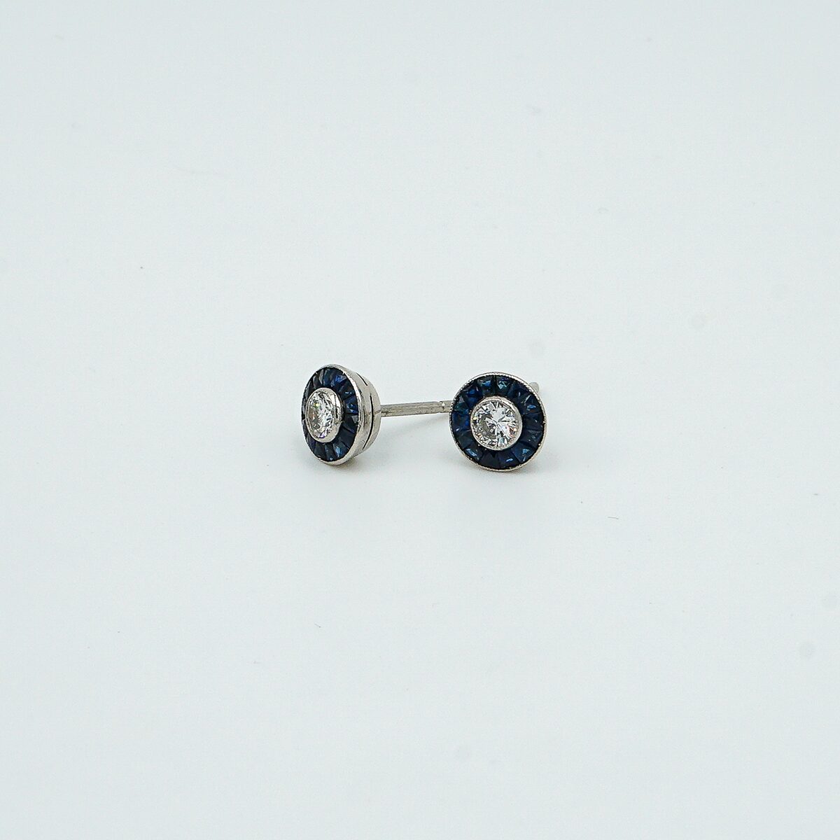 Pendientes ojo de perdiz montados en platino con diamante central de 0,20 cts y orla de zafiros naturales calibrados.