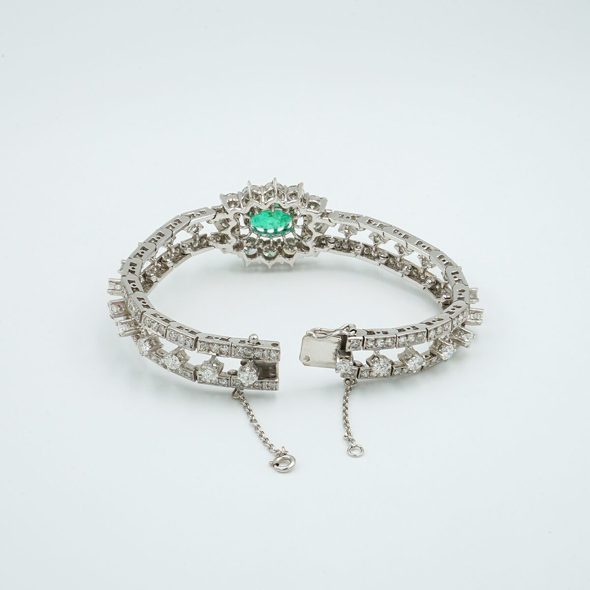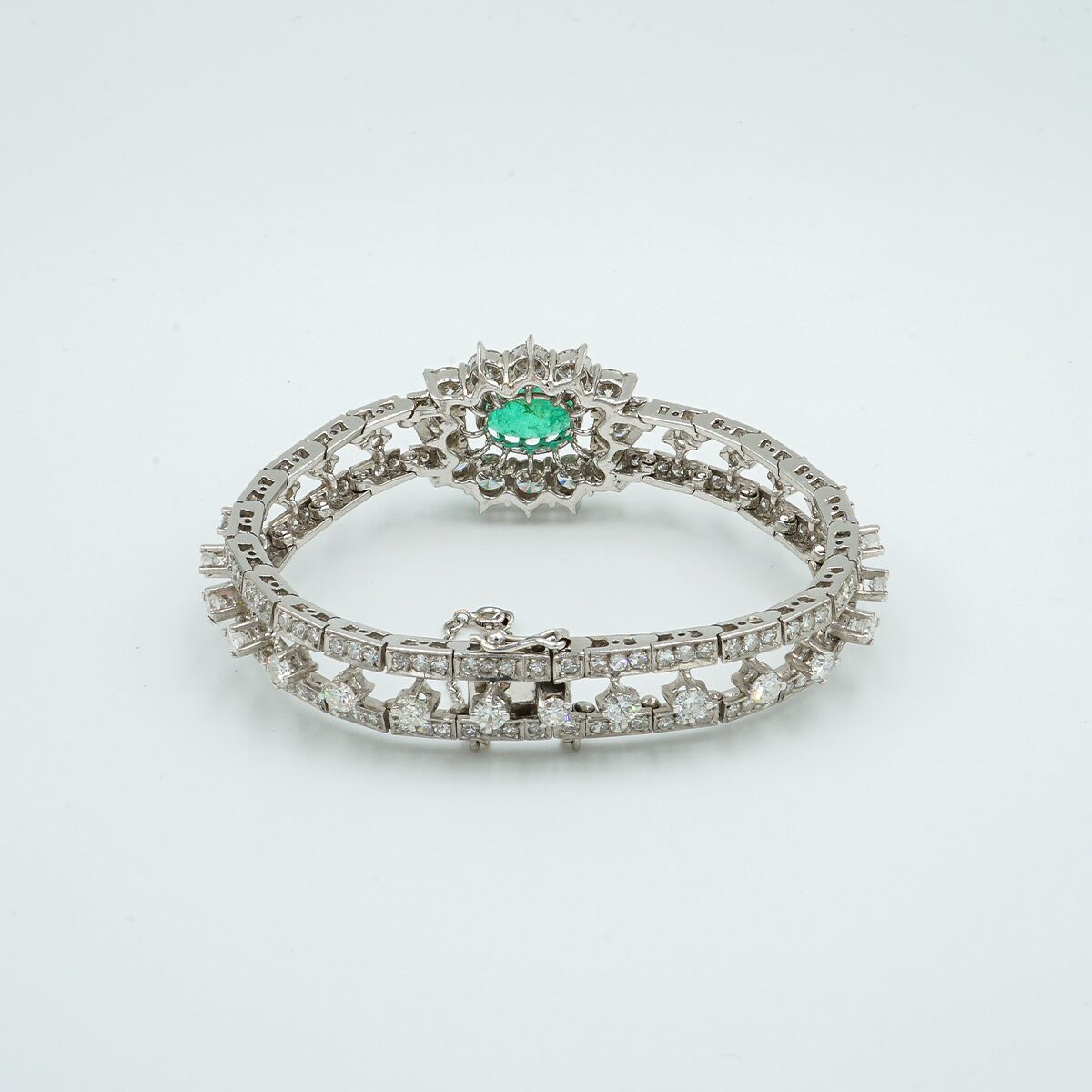 Pulsera años 50 montada en oro blanco de 18k con esmeralda central de origen Colombia de 5 cts y gran orla de diamantes talla brillante y pave de diamantes talla brillante pureza vs2 color G (total brillantes 12,80 cts).