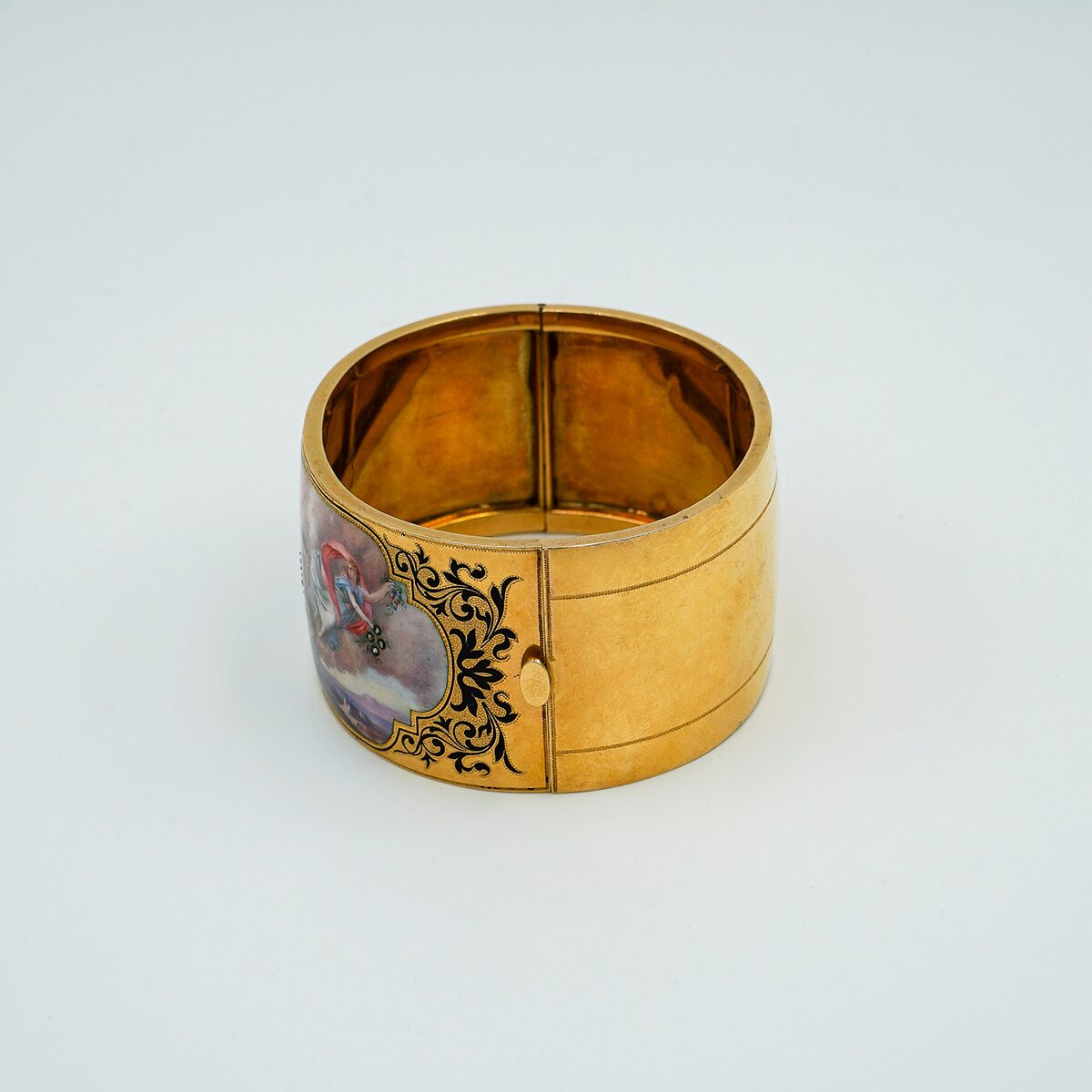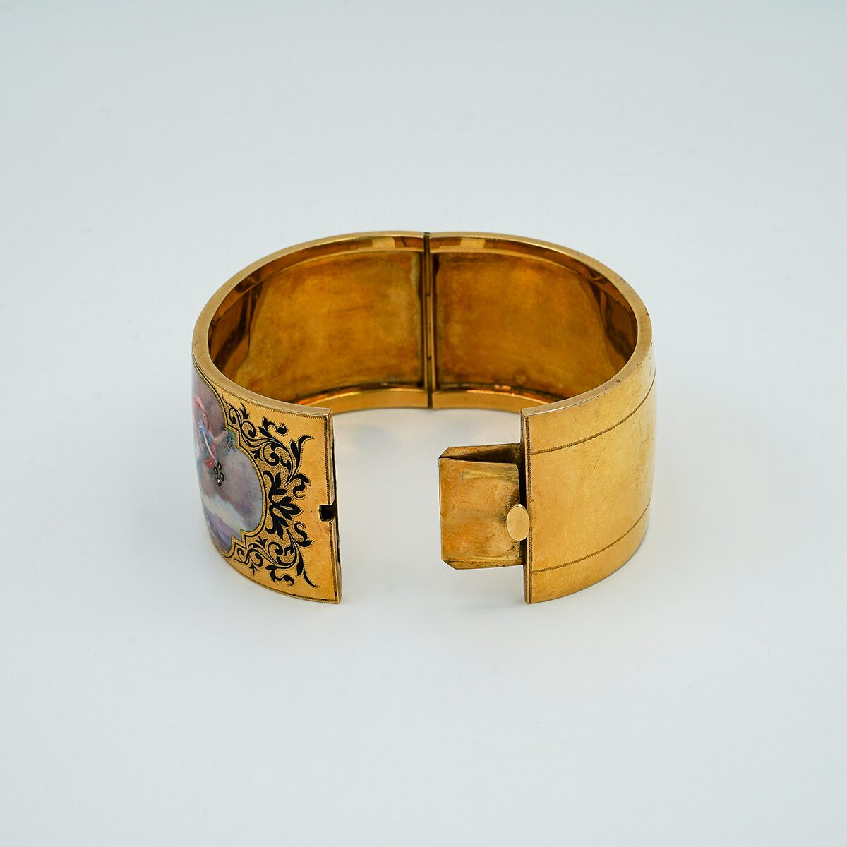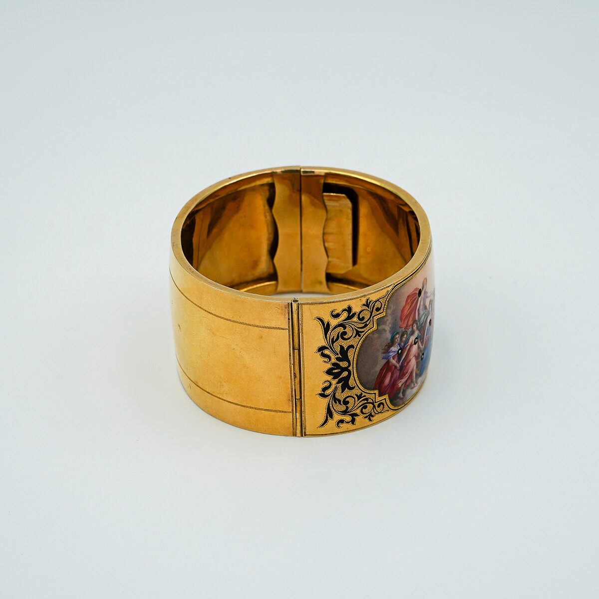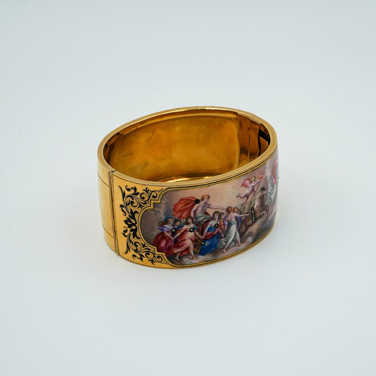 Pulsera Victoriana siglo XIX montada en oro de 18k con magnifico esmalte de escena mitoligica con diamantes incrustados.