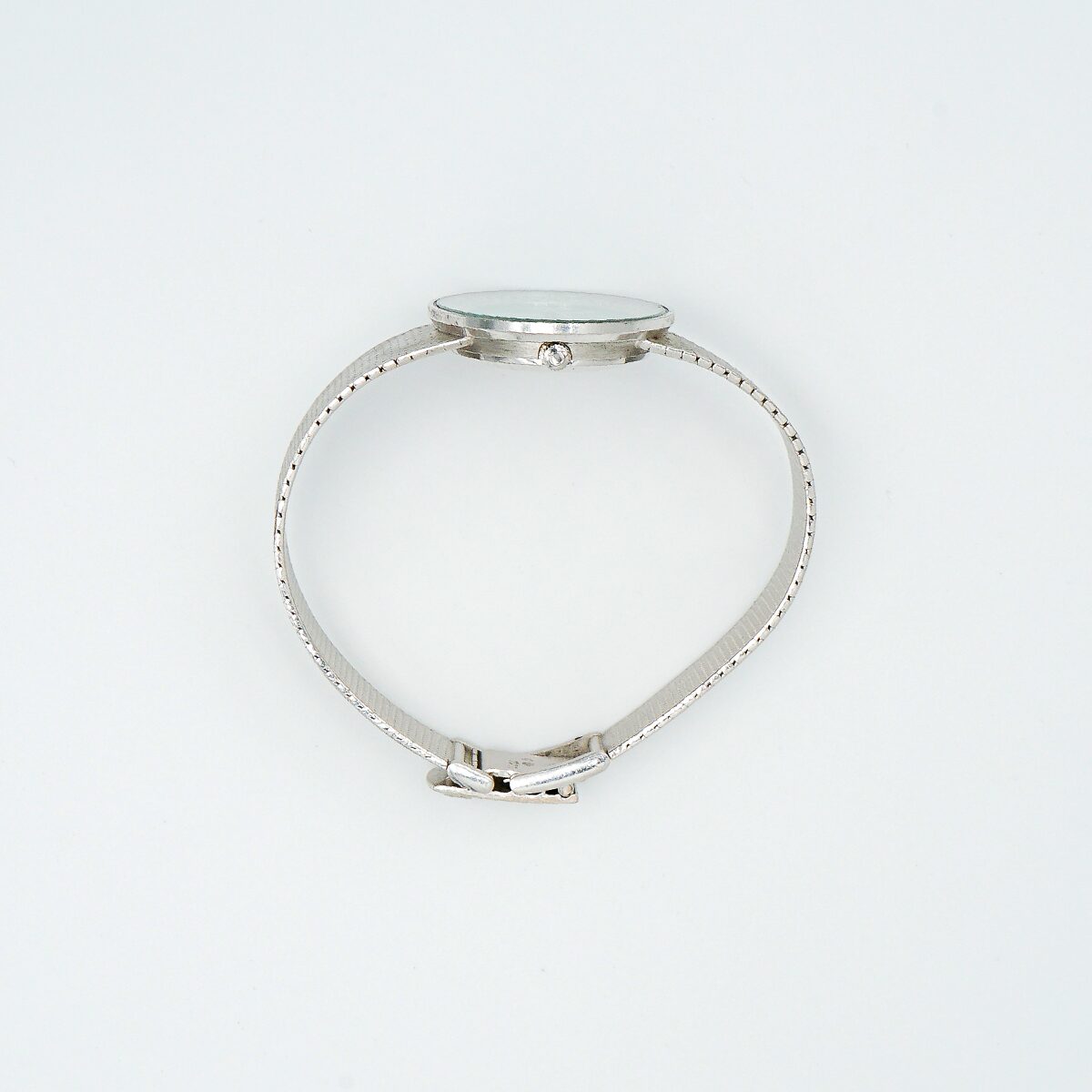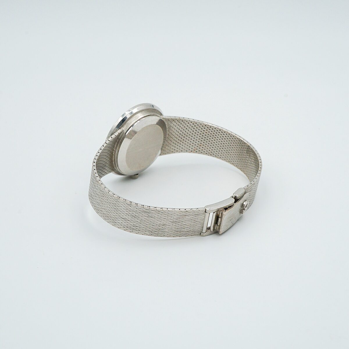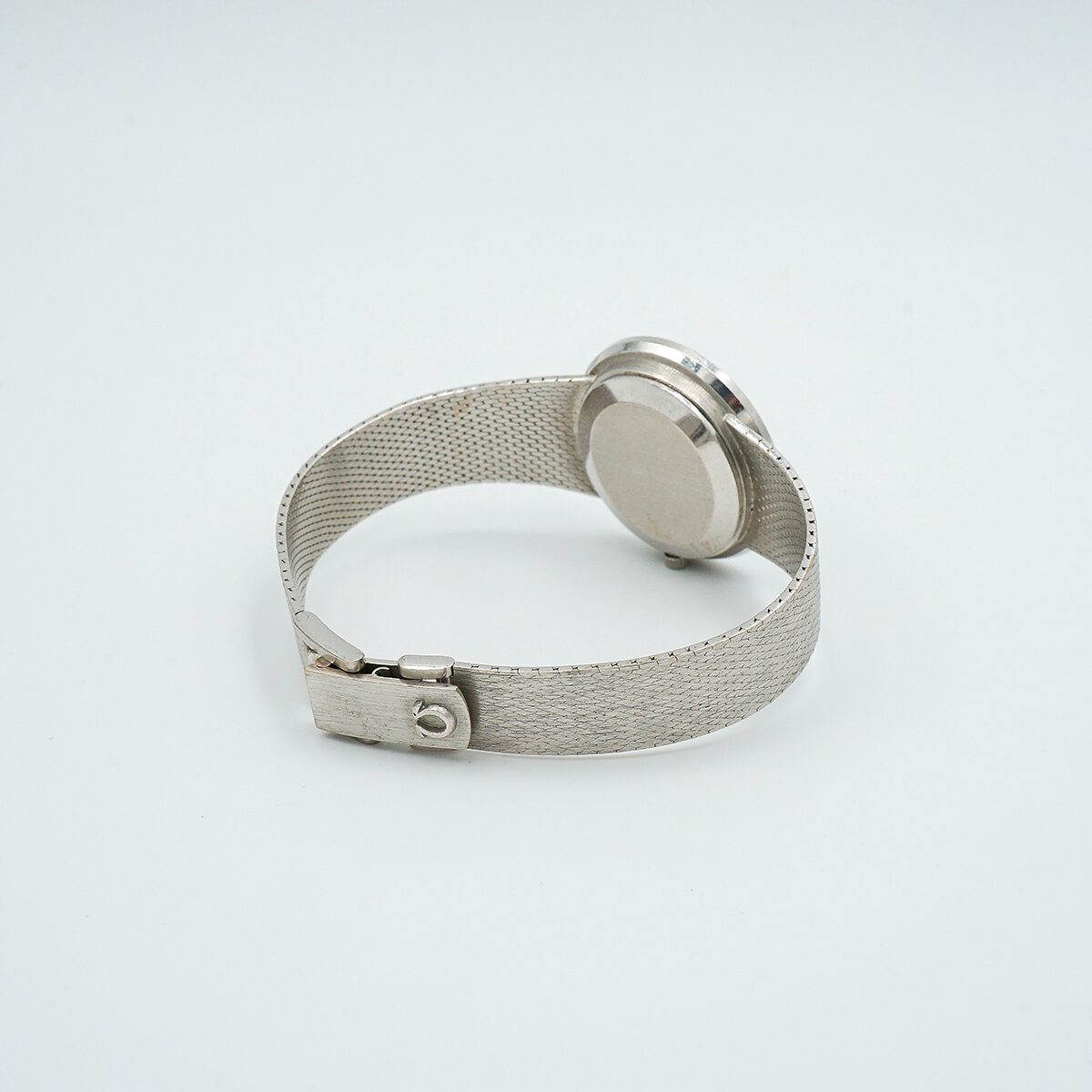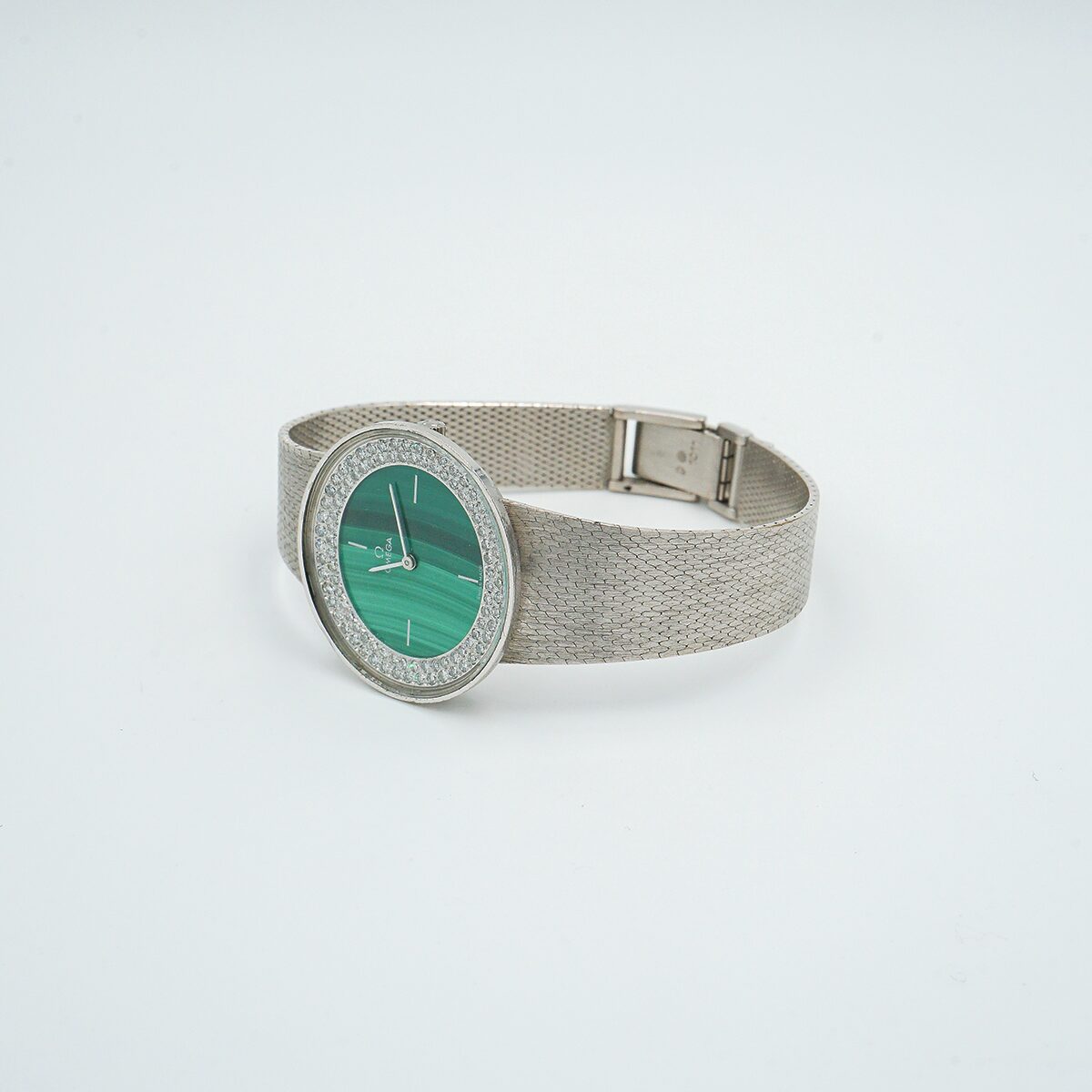 Relos Omega de los años 70 en oro blanco de 18k con esfera de malaquita y doble orla de diamantes talla brillante.